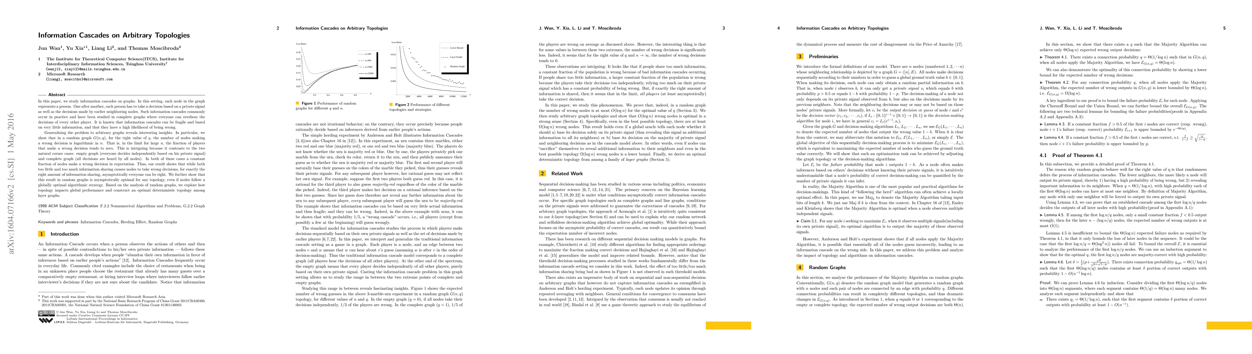In this paper, we study information cascades on graphs. In this setting, each node in the graph represents a person. One after another, each person has to take a decision based on a private signal as well as the decisions made by earlier neighboring nodes. Such information cascades commonly occur in practice and have been studied in complete graphs where everyone can overhear the decisions of every other player. It is known that information cascades can be fragile and based on very little information, and that they have a high likelihood of being wrong. Generalizing the problem to arbitrary graphs reveals interesting insights. In particular, we show that in a random graph $G(n,q)$, for the right value of $q$, the number of nodes making a wrong decision is logarithmic in $n$. That is, in the limit for large $n$, the fraction of players that make a wrong decision tends to zero. This is intriguing because it contrasts to the two natural corner cases: empty graph (everyone decides independently based on his private signal) and complete graph (all decisions are heard by all nodes). In both of these cases a constant fraction of nodes make a wrong decision in expectation. Thus, our result shows that while both too little and too much information sharing causes nodes to take wrong decisions, for exactly the right amount of information sharing, asymptotically everyone can be right. We further show that this result in random graphs is asymptotically optimal for any topology, even if nodes follow a globally optimal algorithmic strategy. Based on the analysis of random graphs, we explore how topology impacts global performance and construct an optimal deterministic topology among layer graphs.