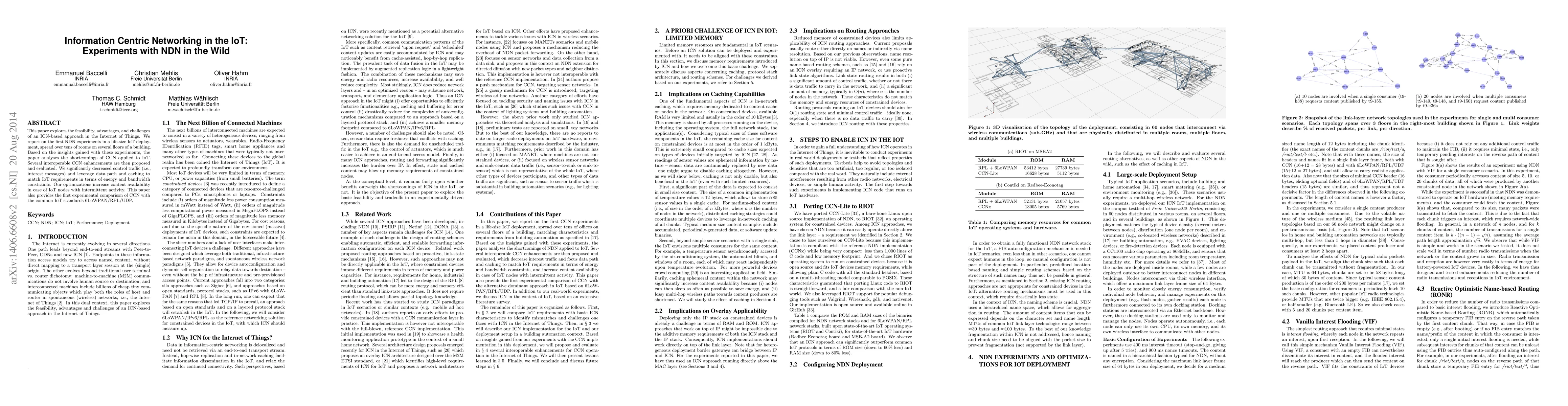 This paper explores the feasibility, advantages, and challenges of an ICN-based approach in the Internet of Things. We report on the first NDN experiments in a life-size IoT deployment, spread over tens of rooms on several floors of a building. Based on the insights gained with these experiments, the paper analyses the shortcomings of CCN applied to IoT. Several interoperable CCN enhancements are then proposed and evaluated. We significantly decreased control traffic (i.e., interest messages) and leverage data path and caching to match IoT requirements in terms of energy and bandwidth constraints. Our optimizations increase content availability in case of IoT nodes with intermittent activity. This paper also provides the first experimental comparison of CCN with the common IoT standards 6LoWPAN/RPL/UDP.