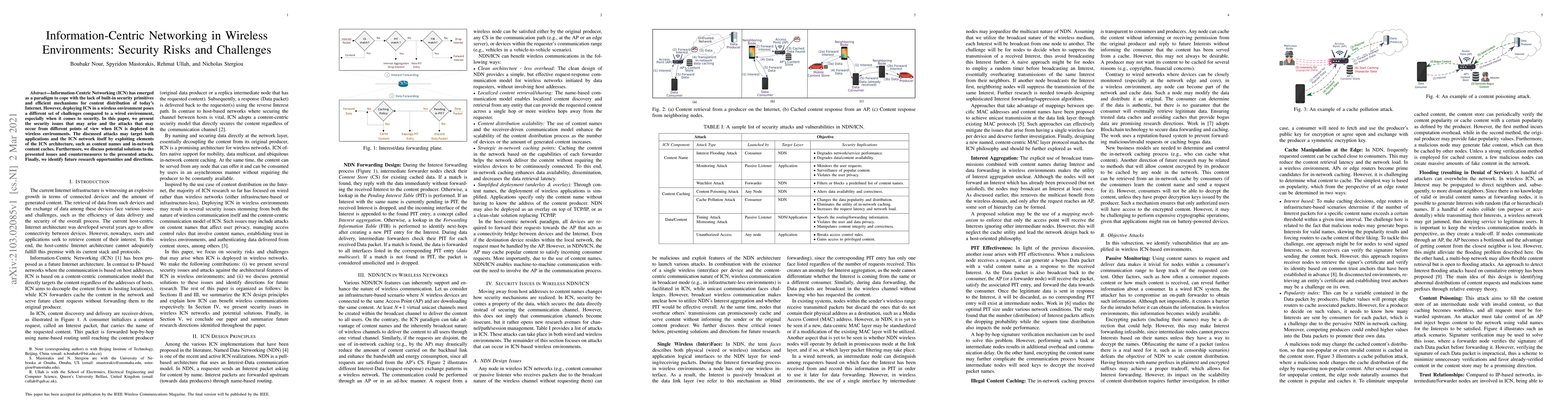 This paper examines security risks and challenges of deploying Information-Centric Networking (ICN) in wireless environments, highlighting specific attacks and vulnerabilities, and proposes potential solutions and countermeasures. It also identifies future research opportunities in this area.