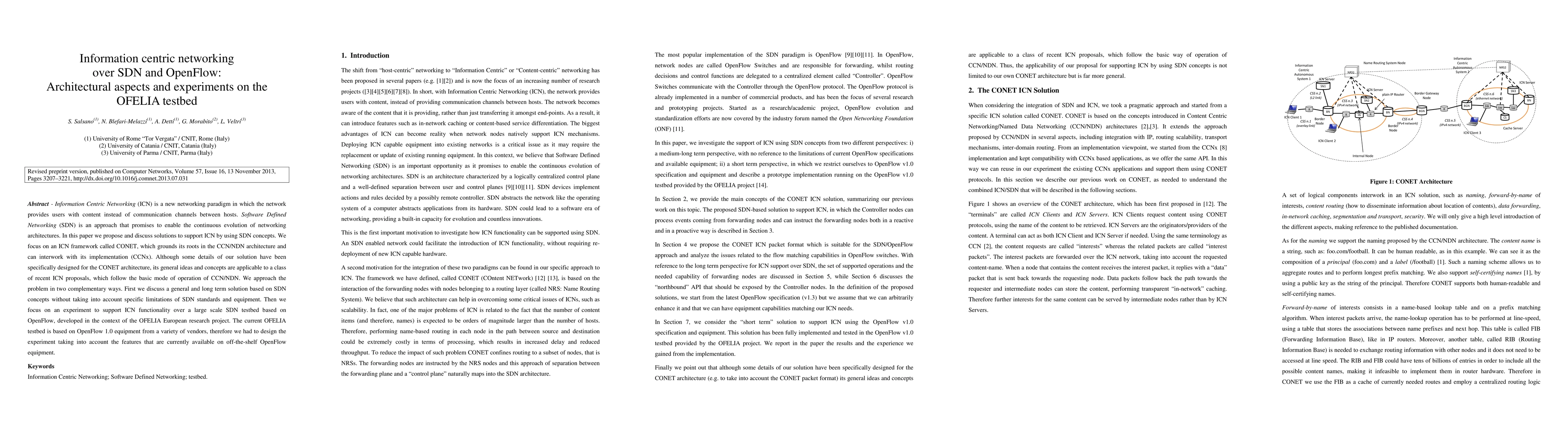 This paper proposes integrating Information Centric Networking (ICN) with Software Defined Networking (SDN) using the CONET framework, grounded in CCN/NDN architecture. It also details experiments conducted on the OFELIA testbed to demonstrate ICN functionality over OpenFlow 1.0 equipment, considering current vendor limitations.