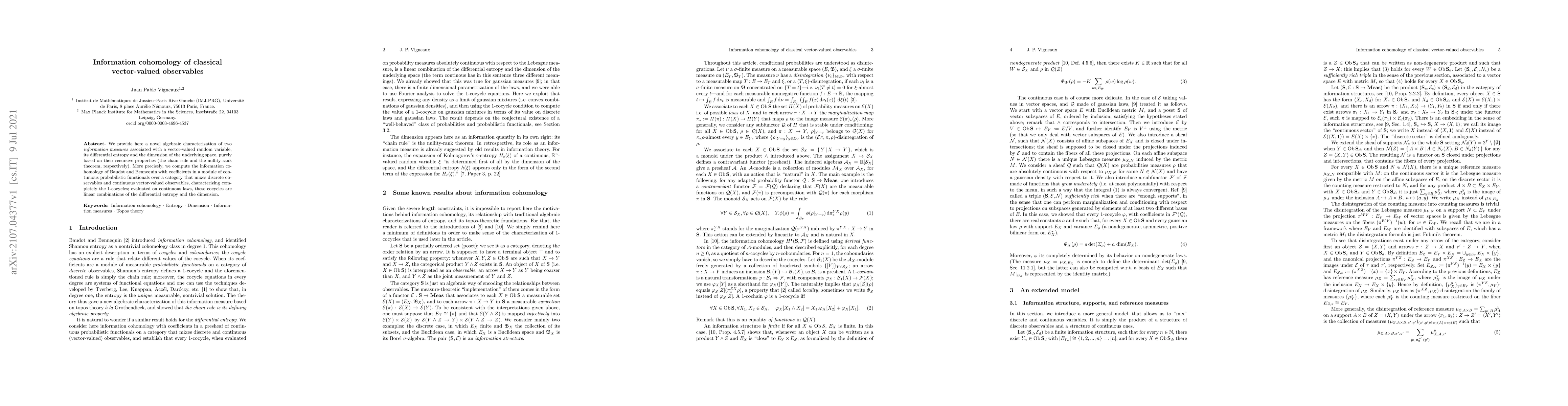 We provide here a novel algebraic characterization of two information measures associated with a vector-valued random variable, its differential entropy and the dimension of the underlying space, purely based on their recursive properties (the chain rule and the nullity-rank theorem, respectively). More precisely, we compute the information cohomology of Baudot and Bennequin with coefficients in a module of continuous probabilistic functionals over a category that mixes discrete observables and continuous vector-valued observables, characterizing completely the 1-cocycles; evaluated on continuous laws, these cocycles are linear combinations of the differential entropy and the dimension.