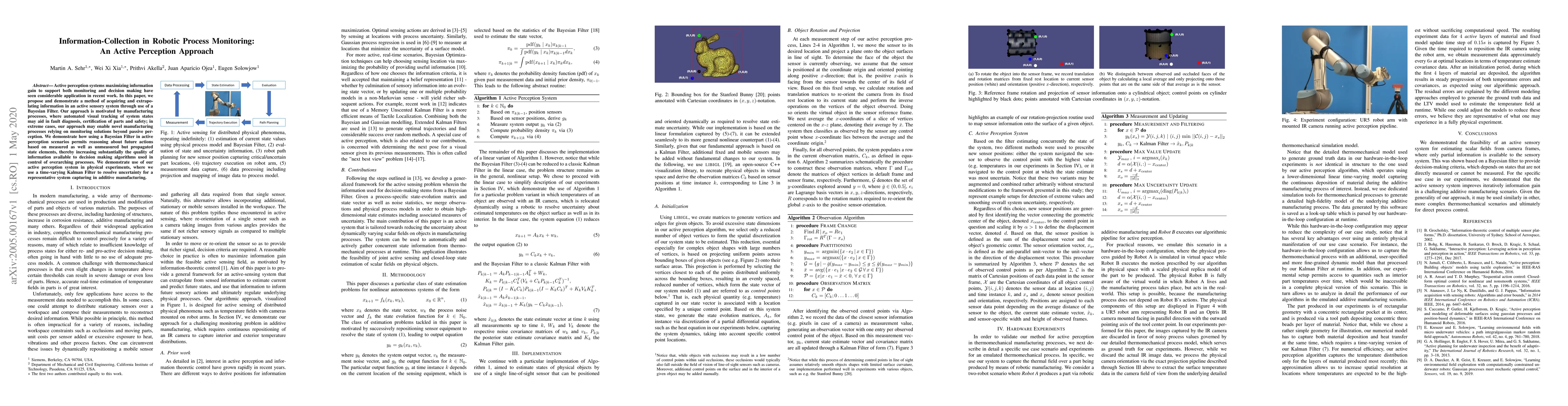 Active perception systems maximizing information gain to support both monitoring and decision making have seen considerable application in recent work. In this paper, we propose and demonstrate a method of acquiring and extrapolating information in an active sensory system through use of a Bayesian Filter. Our approach is motivated by manufacturing processes, where automated visual tracking of system states may aid in fault diagnosis, certification of parts and safety; in extreme cases, our approach may enable novel manufacturing processes relying on monitoring solutions beyond passive perception. We demonstrate how using a Bayesian Filter in active perception scenarios permits reasoning about future actions based on measured as well as unmeasured but propagated state elements, thereby increasing substantially the quality of information available to decision making algorithms used in control of overarching processes. We demonstrate use of our active perception system in physical experiments, where we use a time-varying Kalman Filter to resolve uncertainty for a representative system capturing in additive manufacturing.