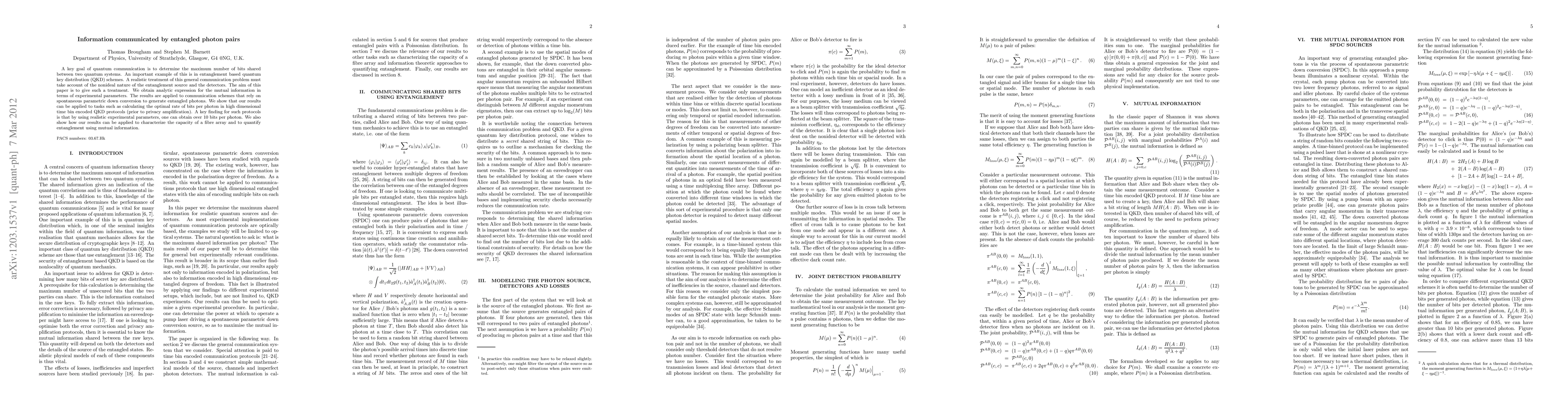 A key goal of quantum communication is to determine the maximum number of bits shared between two quantum systems. An important example of this is in entanglement based quantum key distribution (QKD) schemes. A realistic treatment of this general communication problem must take account of the nonideal nature of the entanglement source and the detectors. The aim of this paper is to give such a treatment. We obtain analytic expression for the mutual information in terms of experimental parameters. The results are applied to communication schemes that rely on spontaneous parametric down conversion to generate entangled photons. We show that our results can be applied to tasks such as calculating the optimal rate of bits per photon in high dimensional time bin encoded QKD protocols (prior to privacy amplification). A key finding for such protocols is that by using realistic experimental parameters, one can obtain over 10 bits per photon. We also show how our results can be applied to characterize the capacity of a fibre array and to quantify entanglement using mutual information.