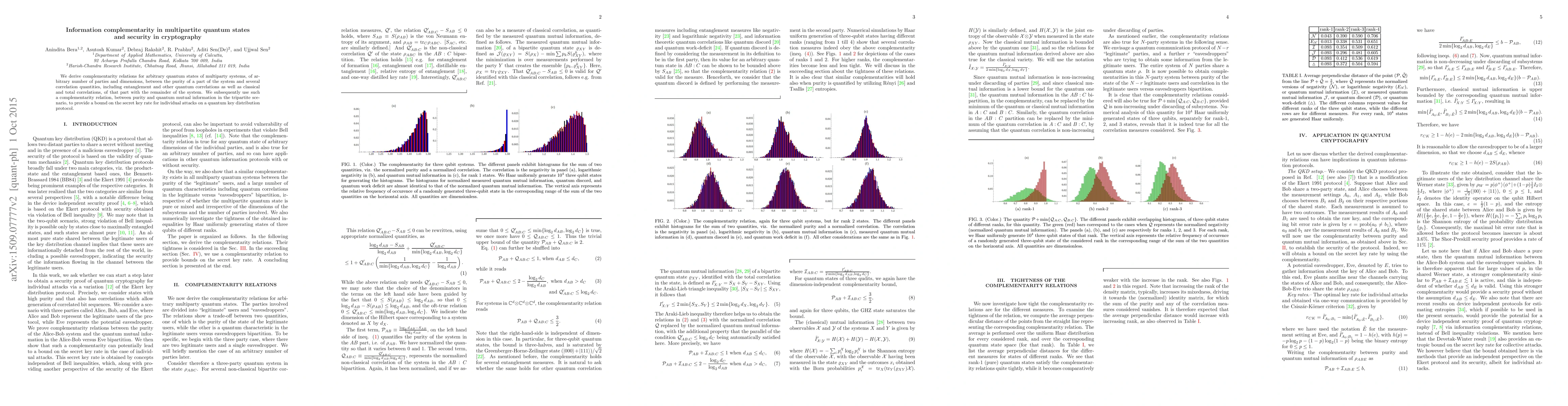 This paper derives complementarity relations for multipartite quantum states, linking the purity of a subsystem with various correlations, and uses these relations to bound the secret key rate in quantum key distribution protocols, enhancing security understanding.