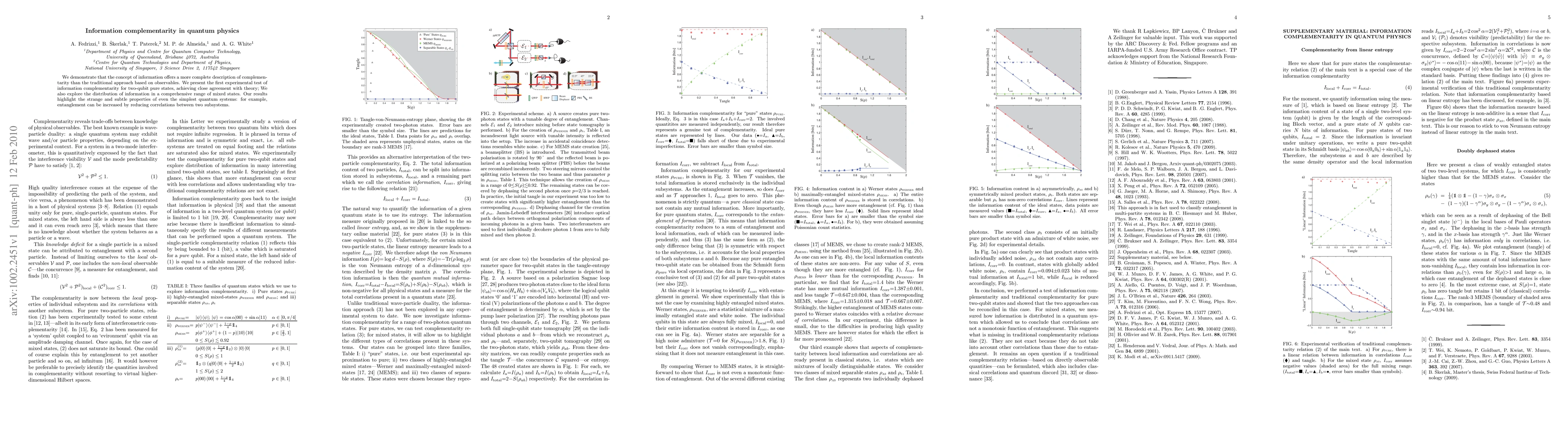 This paper experimentally tests the concept of information complementarity in quantum physics, showing that it provides a more complete description than traditional observable-based approaches. The study confirms theoretical predictions with two-qubit pure states and explores information distribution in mixed states, revealing intriguing properties like increased entanglement through reduced subsystem correlations.