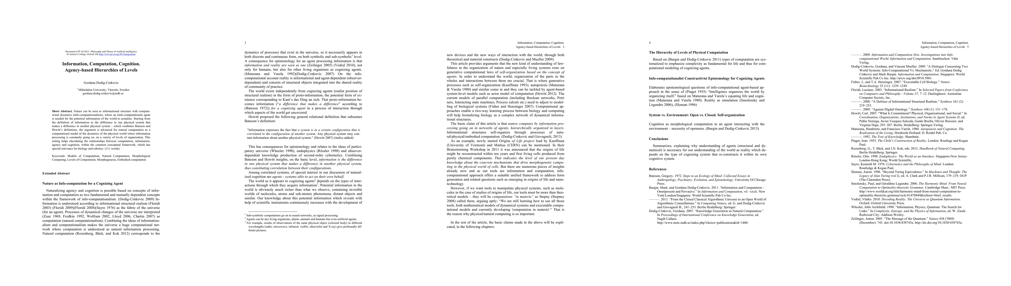Nature can be seen as informational structure with computational dynamics (info-computationalism), where an (info-computational) agent is needed for the potential information of the world to actualize. Starting from the definition of information as the difference in one physical system that makes a difference in another physical system, which combines Bateson and Hewitt definitions, the argument is advanced for natural computation as a computational model of the dynamics of the physical world where information processing is constantly going on, on a variety of levels of organization. This setting helps elucidating the relationships between computation, information, agency and cognition, within the common conceptual framework, which has special relevance for biology and robotics.