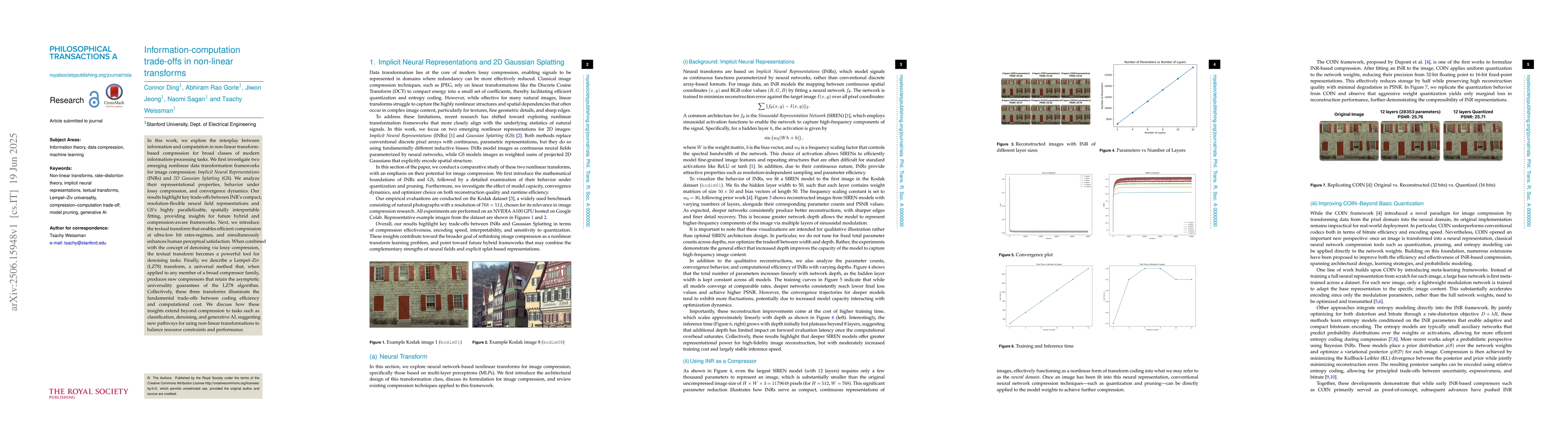 This research explores the balance between information processing and computation in non-linear transforms for tasks like image compression and textual data. It analyzes Implicit Neural Representations (INRs) and 2D Gaussian Splatting (GS), highlighting their trade-offs. The paper also introduces a textual transform for ultra-low bitrate compression and human perceptual satisfaction, and a Lempel-Ziv (LZ78) 'transform' for creating new compressors. These findings suggest new approaches for resource-constrained tasks in AI.
