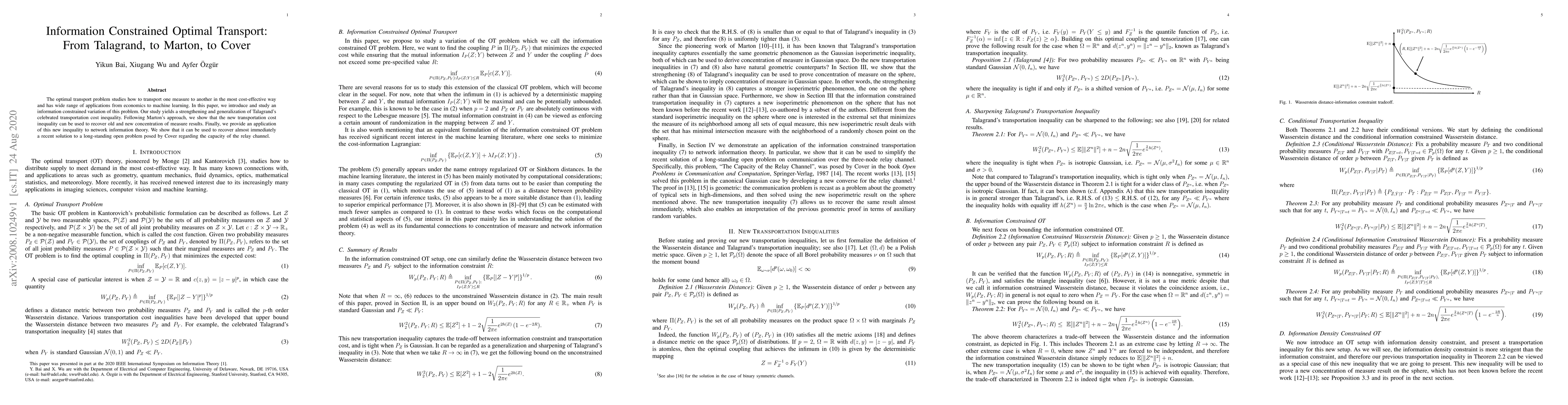 Researchers introduce an information-constrained optimal transport problem, strengthening Talagrand's transportation cost inequality and applying it to network information theory, solving a long-standing open problem on the relay channel's capacity.