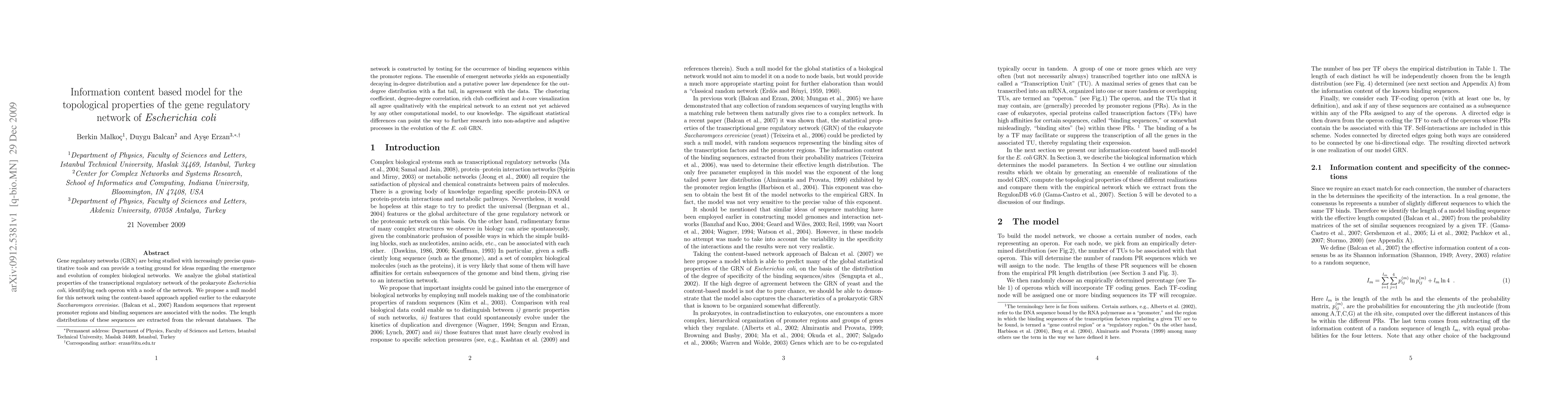 Gene regulatory networks (GRN) are being studied with increasingly precise quantitative tools and can provide a testing ground for ideas regarding the emergence and evolution of complex biological networks. We analyze the global statistical properties of the transcriptional regulatory network of the prokaryote Escherichia coli, identifying each operon with a node of the network. We propose a null model for this network using the content-based approach applied earlier to the eukaryote Saccharomyces cerevisiae. (Balcan et al., 2007) Random sequences that represent promoter regions and binding sequences are associated with the nodes. The length distributions of these sequences are extracted from the relevant databases. The network is constructed by testing for the occurrence of binding sequences within the promoter regions. The ensemble of emergent networks yields an exponentially decaying in-degree distribution and a putative power law dependence for the out-degree distribution with a flat tail, in agreement with the data. The clustering coefficient, degree-degree correlation, rich club coefficient and k-core visualization all agree qualitatively with the empirical network to an extent not yet achieved by any other computational model, to our knowledge. The significant statistical differences can point the way to further research into non-adaptive and adaptive processes in the evolution of the E. coli GRN.