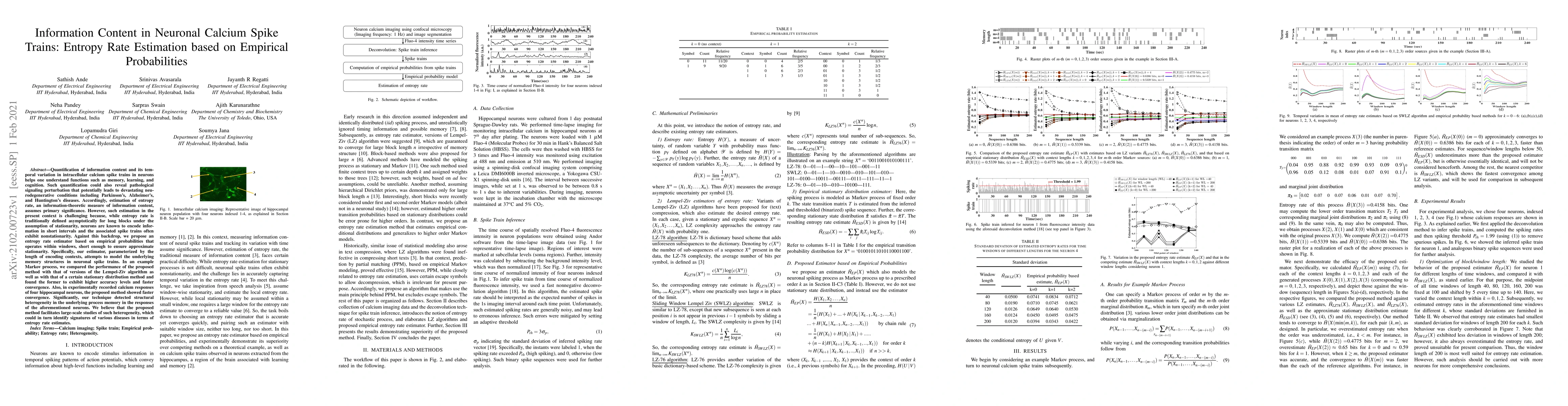 Quantification of information content and its temporal variation in intracellular calcium spike trains in neurons helps one understand functions such as memory, learning, and cognition. Such quantification could also reveal pathological signaling perturbation that potentially leads to devastating neurodegenerative conditions including Parkinson's, Alzheimer's, and Huntington's diseases. Accordingly, estimation of entropy rate, an information-theoretic measure of information content, assumes primary significance. However, such estimation in the present context is challenging because, while entropy rate is traditionally defined asymptotically for long blocks under the assumption of stationarity, neurons are known to encode information in short intervals and the associated spike trains often exhibit nonstationarity. Against this backdrop, we propose an entropy rate estimator based on empirical probabilities that operates within windows, short enough to ensure approximate stationarity. Specifically, our estimator, parameterized by the length of encoding contexts, attempts to model the underlying memory structures in neuronal spike trains. In an example Markov process, we compared the performance of the proposed method with that of versions of the Lempel-Ziv algorithm as well as with that of a certain stationary distribution method and found the former to exhibit higher accuracy levels and faster convergence. Also, in experimentally recorded calcium responses of four hippocampal neurons, the proposed method showed faster convergence. Significantly, our technique detected structural heterogeneity in the underlying process memory in the responses of the aforementioned neurons. We believe that the proposed method facilitates large-scale studies of such heterogeneity, which could in turn identify signatures of various diseases in terms of entropy rate estimates.