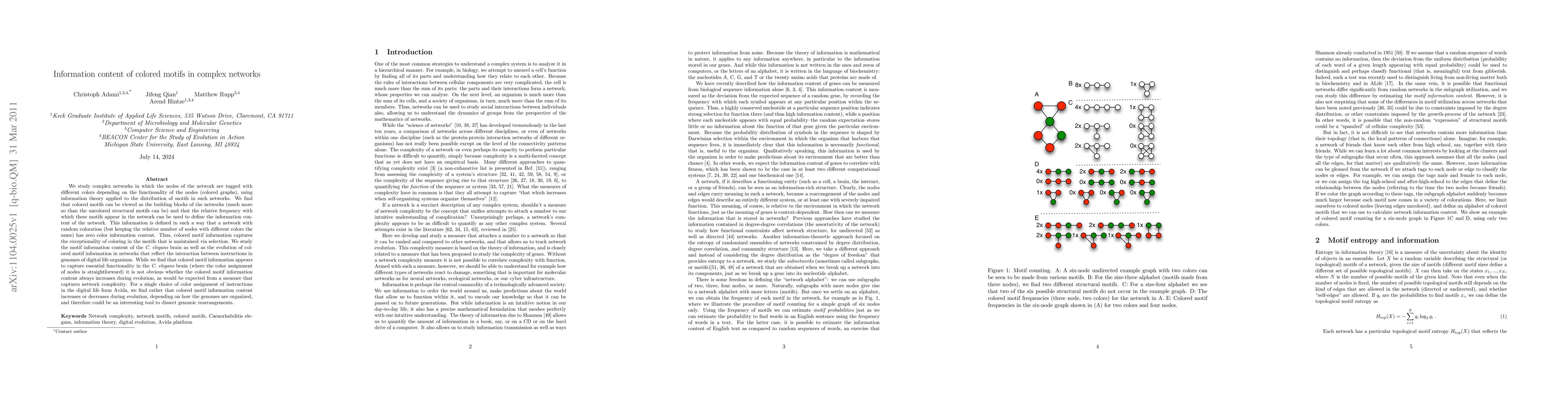 This paper investigates complex networks with colored nodes, applying information theory to motif distributions to define network information content. It finds that colored motifs are crucial building blocks and that their relative frequency captures the exceptionality of color assignments, which is maintained via selection. The study applies this concept to the C. elegans brain and digital life organisms, suggesting that colored motif information can reveal essential functionality and genomic rearrangements.