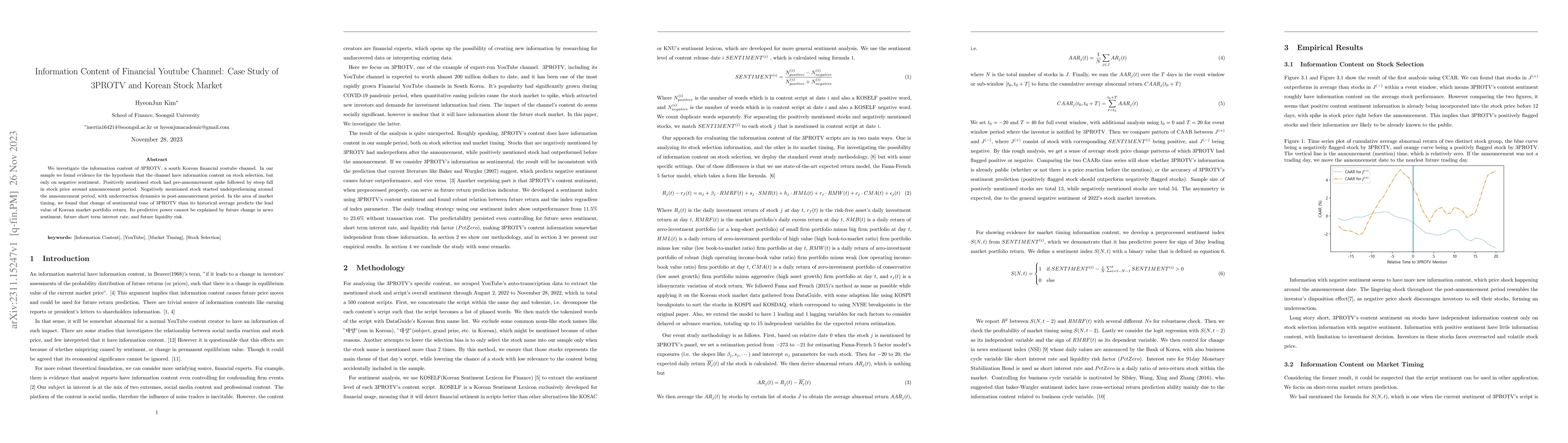 We investigate the information content of 3PROTV, a south Korean financial youtube channel. In our sample we found evidence for the hypothesis that the channel have information content on stock selection, but only on negative sentiment. Positively mentioned stock had pre-announcement spike followed by steep fall in stock price around announcement period. Negatively mentioned stock started underperforming around the announcement period, with underreaction dynamics in post-announcement period. In the area of market timing, we found that change of sentimental tone of 3PROTV than its historical average predicts the lead value of Korean market portfolio return. Its predictive power cannot be explained by future change in news sentiment, future short term interest rate, and future liquidity risk.