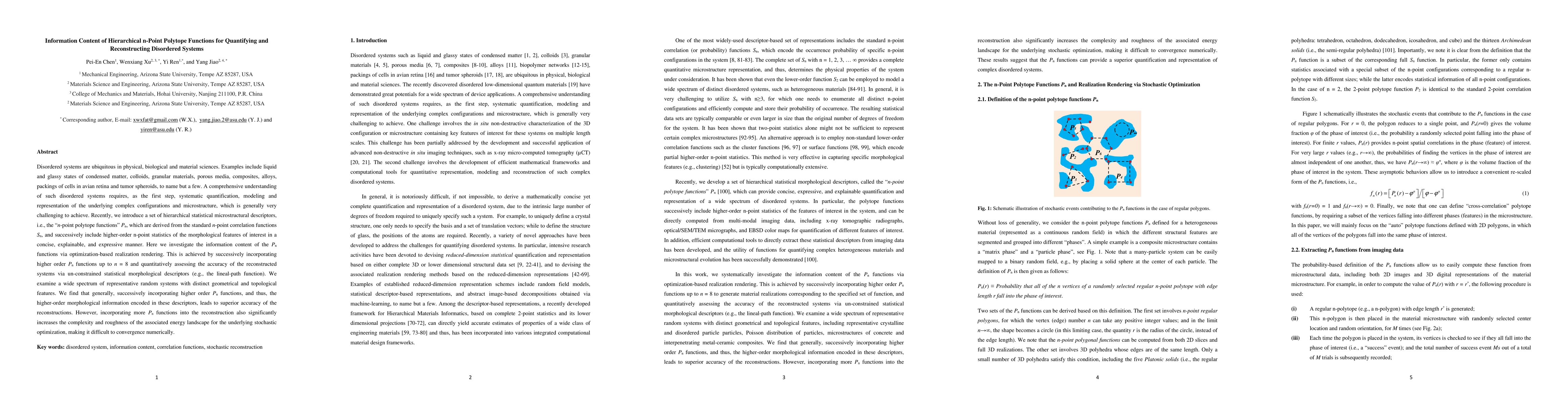 The paper introduces hierarchical n-point polytope functions (Pn) as a set of statistical microstructural descriptors for disordered systems, derived from standard n-point correlation functions (Sn) and successively including higher-order n-point statistics.