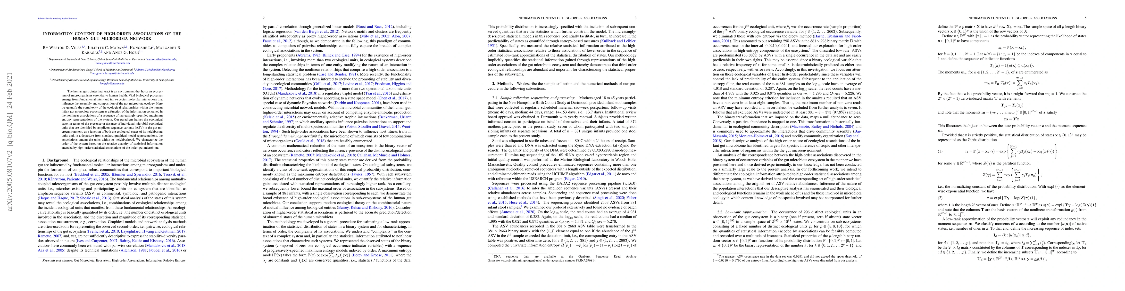 The human gastrointestinal tract is an environment that hosts an ecosystem of microorganisms essential to human health. Vital biological processes emerge from fundamental inter- and intra-species molecular interactions that influence the assembly and composition of the gut microbiota ecology. Here we quantify the complexity of the ecological relationships within the human infant gut microbiota ecosystem as a function of the information contained in the nonlinear associations of a sequence of increasingly-specified maximum entropy representations of the system. Our paradigm frames the ecological state, in terms of the presence or absence of individual microbial ecological units that are identified by amplicon sequence variants (ASV) in the gut microenvironment, as a function of both the ecological states of its neighboring units and, in a departure from standard graphical model representations, the associations among the units within its neighborhood. We characterize the order of the system based on the relative quantity of statistical information encoded by high-order statistical associations of the infant gut microbiota.