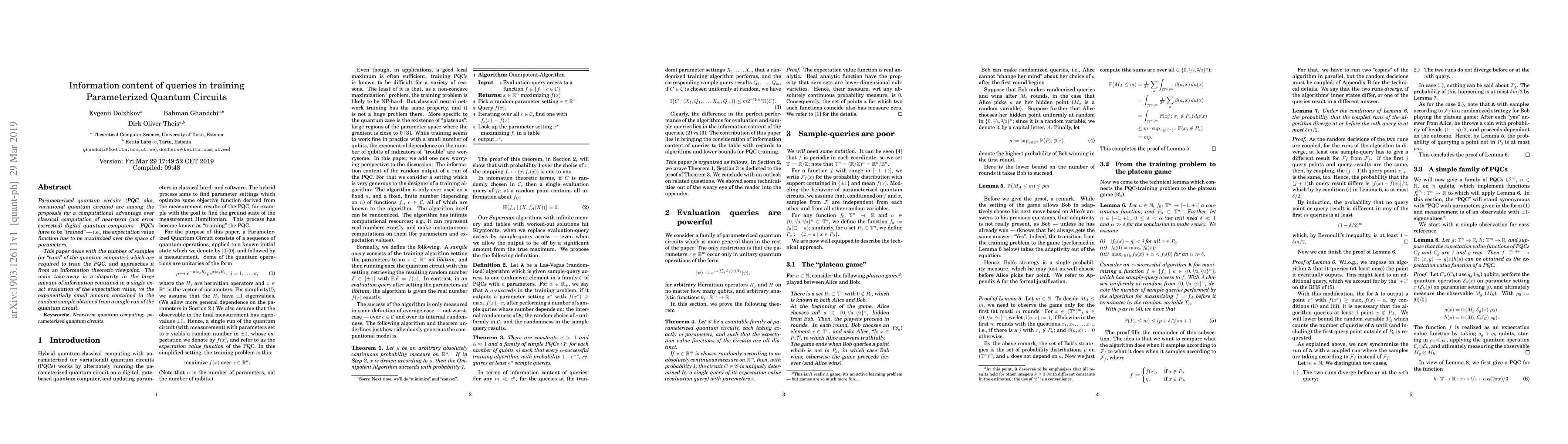 Parameterized quantum circuits (PQC, aka, variational quantum circuits) are among the proposals for a computational advantage over classical computation of near-term (not fault tolerant) digital quantum computers. PQCs have to be "trained" -- i.e., the expectation value function has to be maximized over the space of parameters. This paper deals with the number of samples (or "runs" of the quantum computer) which are required to train the PQC, and approaches it from an information theoretic viewpoint. The main take-away is a disparity in the large amount of information contained in a single exact evaluation of the expectation value, vs the exponentially small amount contained in the random sample obtained from a single run of the quantum circuit.