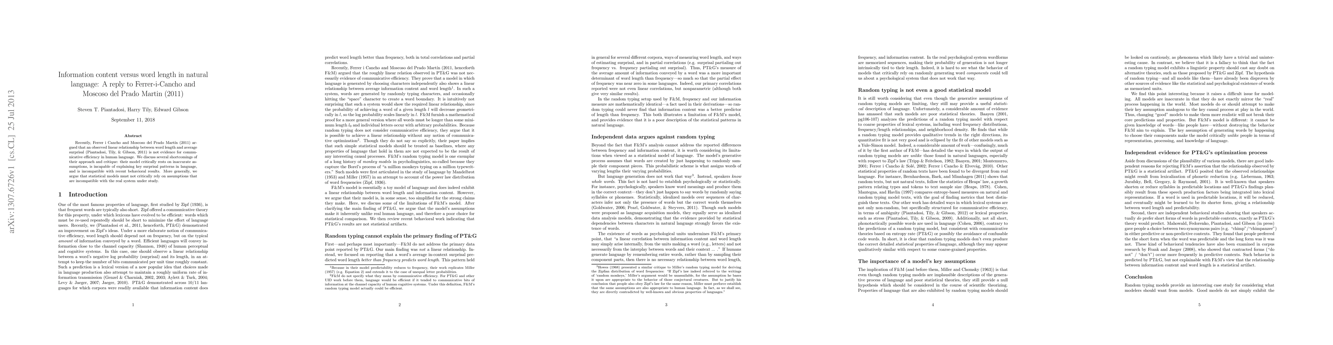 Recently, Ferrer i Cancho and Moscoso del Prado Martin [arXiv:1209.1751] argued that an observed linear relationship between word length and average surprisal (Piantadosi, Tily, & Gibson, 2011) is not evidence for communicative efficiency in human language. We discuss several shortcomings of their approach and critique: their model critically rests on inaccurate assumptions, is incapable of explaining key surprisal patterns in language, and is incompatible with recent behavioral results. More generally, we argue that statistical models must not critically rely on assumptions that are incompatible with the real system under study.