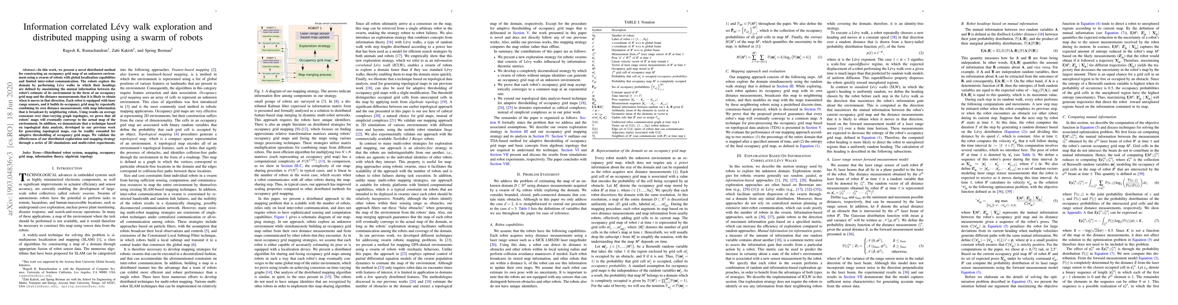 This paper proposes a distributed method for constructing an occupancy grid map using a swarm of robots that perform Levy walks to explore an unknown environment. The robots maximize mutual information between their map estimates and expected distance measurements, and their maps converge to the actual environment map through consensus over time-varying topologies.