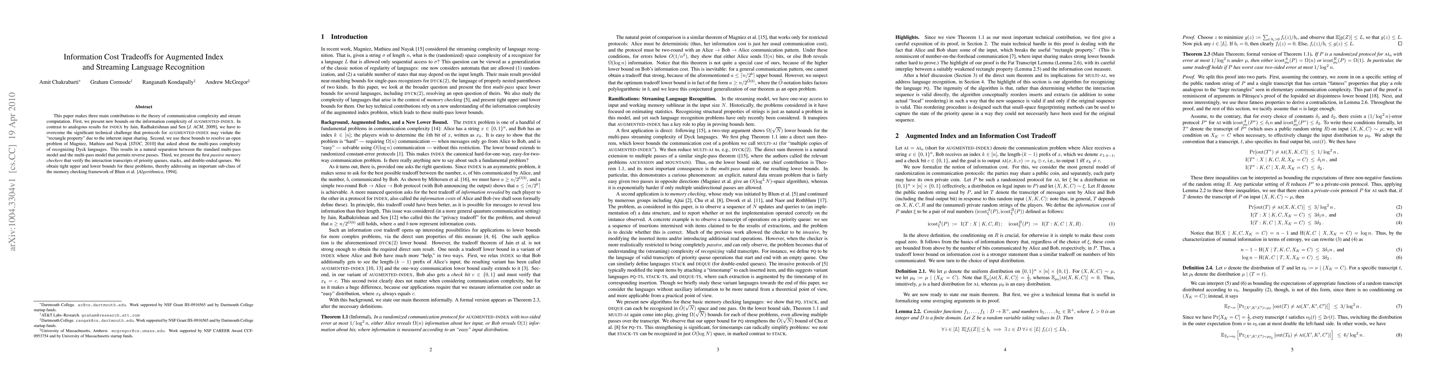 This paper makes three main contributions to the theory of communication complexity and stream computation. First, we present new bounds on the information complexity of AUGMENTED-INDEX. In contrast to analogous results for INDEX by Jain, Radhakrishnan and Sen [J. ACM, 2009], we have to overcome the significant technical challenge that protocols for AUGMENTED-INDEX may violate the "rectangle property" due to the inherent input sharing. Second, we use these bounds to resolve an open problem of Magniez, Mathieu and Nayak [STOC, 2010] that asked about the multi-pass complexity of recognizing Dyck languages. This results in a natural separation between the standard multi-pass model and the multi-pass model that permits reverse passes. Third, we present the first passive memory checkers that verify the interaction transcripts of priority queues, stacks, and double-ended queues. We obtain tight upper and lower bounds for these problems, thereby addressing an important sub-class of the memory checking framework of Blum et al. [Algorithmica, 1994].