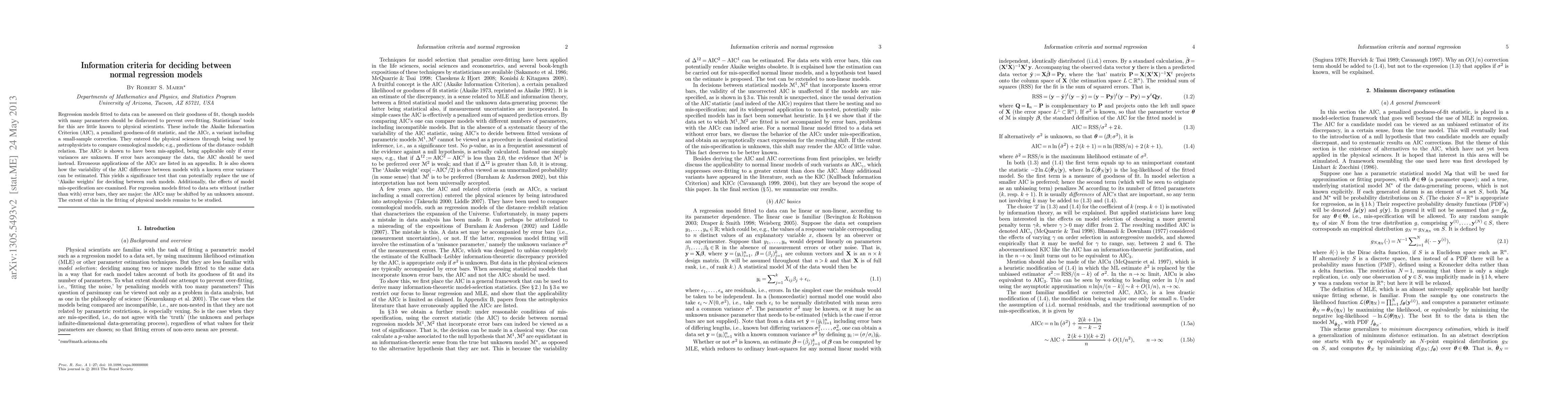 Regression models fitted to data can be assessed on their goodness of fit, though models with many parameters should be disfavored to prevent over-fitting. Statisticians' tools for this are little known to physical scientists. These include the Akaike Information Criterion (AIC), a penalized goodness-of-fit statistic, and the AICc, a variant including a small-sample correction. They entered the physical sciences through being used by astrophysicists to compare cosmological models; e.g., predictions of the distance-redshift relation. The AICc is shown to have been misapplied, being applicable only if error variances are unknown. If error bars accompany the data, the AIC should be used instead. Erroneous applications of the AICc are listed in an appendix. It is also shown how the variability of the AIC difference between models with a known error variance can be estimated. This yields a significance test that can potentially replace the use of `Akaike weights' for deciding between such models. Additionally, the effects of model misspecification are examined. For regression models fitted to data sets without (rather than with) error bars, they are major: the AICc may be shifted by an unknown amount. The extent of this in the fitting of physical models remains to be studied.
