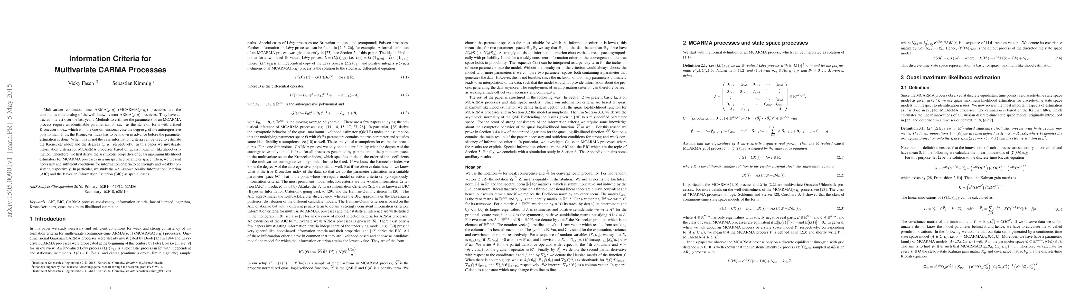 This paper investigates information criteria for estimating the parameters of multivariate continuous-time ARMA processes (MCARMA), focusing on the Kronecker index and degrees (p,q). It derives asymptotic properties of quasi maximum likelihood estimators and presents conditions for the consistency of criteria like AIC and BIC.
