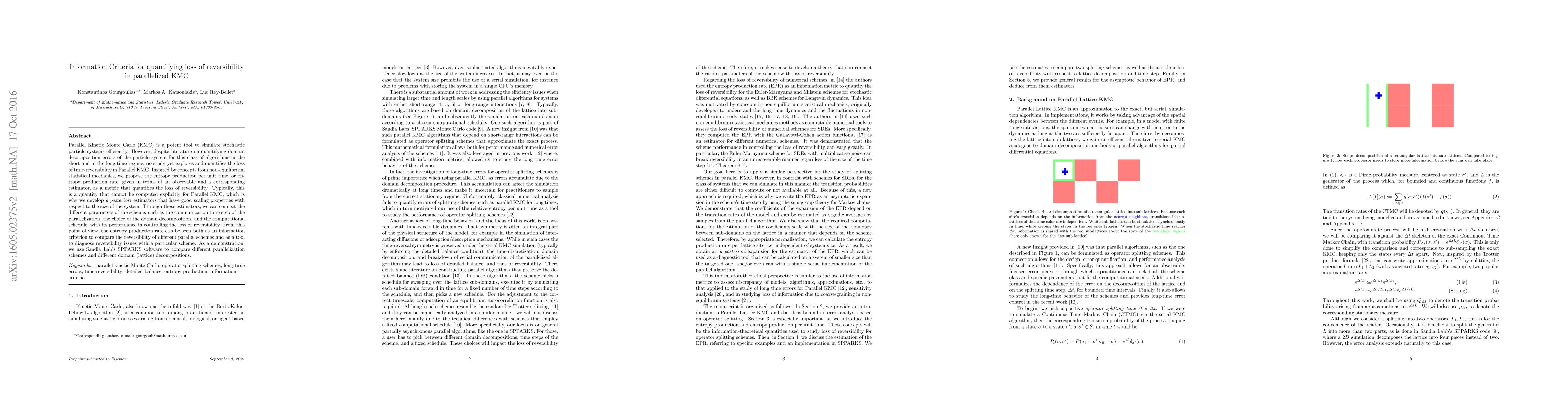 Parallel Kinetic Monte Carlo (KMC) is a potent tool to simulate stochastic particle systems efficiently. However, despite literature on quantifying domain decomposition errors of the particle system for this class of algorithms in the short and in the long time regime, no study yet explores and quantifies the loss of time-reversibility in Parallel KMC. Inspired by concepts from non-equilibrium statistical mechanics, we propose the entropy production per unit time, or entropy production rate, given in terms of an observable and a corresponding estimator, as a metric that quantifies the loss of reversibility. Typically, this is a quantity that cannot be computed explicitly for Parallel KMC, which is why we develop a posteriori estimators that have good scaling properties with respect to the size of the system. Through these estimators, we can connect the different parameters of the scheme, such as the communication time step of the parallelization, the choice of the domain decomposition, and the computational schedule, with its performance in controlling the loss of reversibility. From this point of view, the entropy production rate can be seen both as an information criterion to compare the reversibility of different parallel schemes and as a tool to diagnose reversibility issues with a particular scheme. As a demonstration, we use Sandia Lab's SPPARKS software to compare different parallelization schemes and different domain (lattice) decompositions.