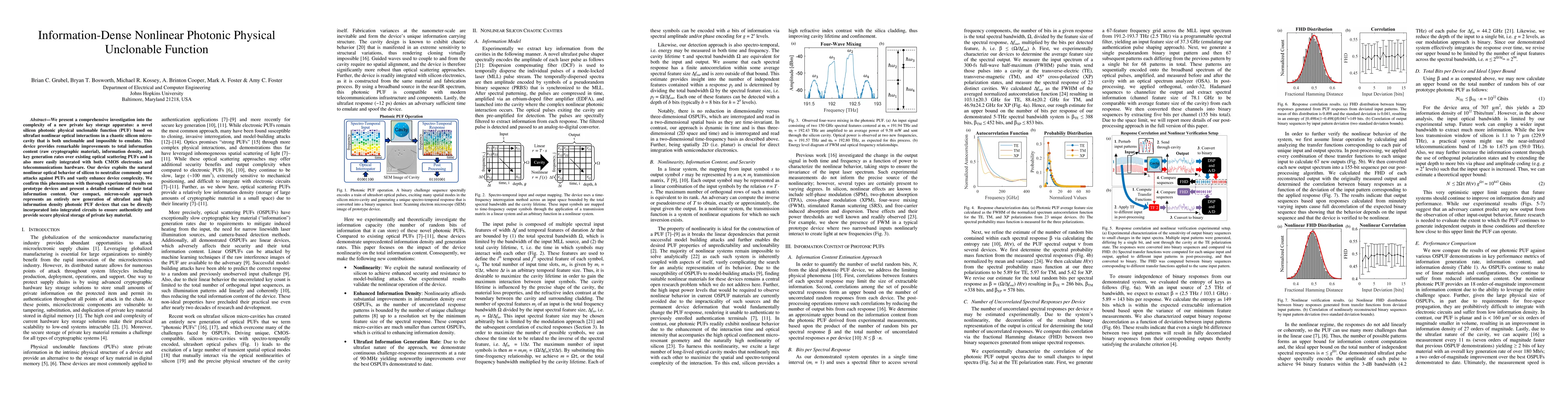This paper introduces a novel silicon photonic PUF leveraging nonlinear optical interactions in a silicon microcavity for secure private key storage, offering superior information density, complexity, and integration potential with CMOS and telecommunications systems, validated through experimental prototypes.