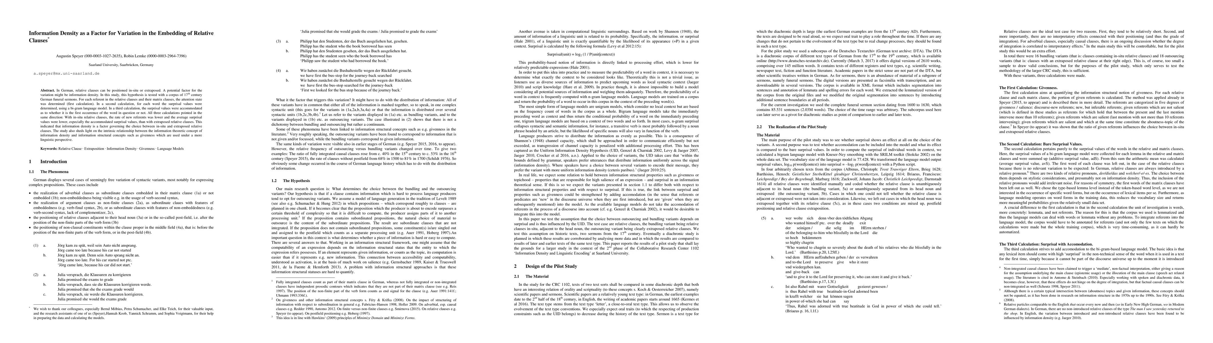 In German, relative clauses can be positioned in-situ or extraposed. A potential factor for the variation might be information density. In this study, this hypothesis is tested with a corpus of 17th century German funeral sermons. For each referent in the relative clauses and their matrix clauses, the attention state was determined (first calculation). In a second calculation, for each word the surprisal values were determined, using a bi-gram language model. In a third calculation, the surprisal values were accommodated as to whether it is the first occurrence of the word in question or not. All three calculations pointed in the same direction: With in-situ relative clauses, the rate of new referents was lower and the average surprisal values were lower, especially the accommodated surprisal values, than with extraposed relative clauses. This indicated that in-formation density is a factor governing the choice between in-situ and extraposed relative clauses. The study also sheds light on the intrinsic relation-ship between the information theoretic concept of information density and in-formation structural concepts such as givenness which are used under a more linguistic perspective.