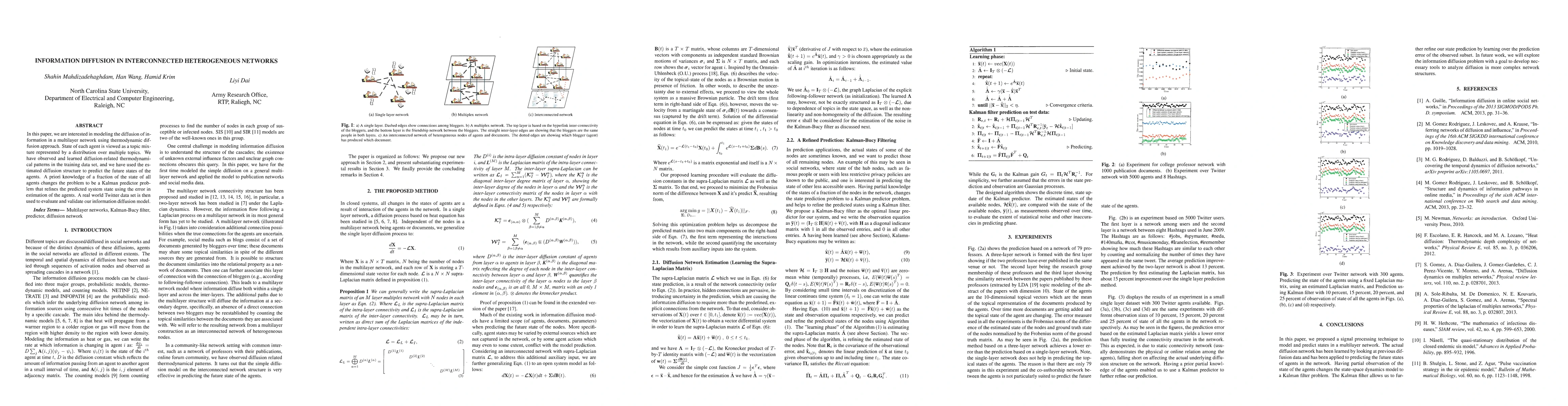 In this paper, we are interested in modeling the diffusion of information in a multilayer network using thermodynamic diffusion approach. State of each agent is viewed as a topic mixture represented by a distribution over multiple topics. We have observed and learned diffusion-related thermodynamical patterns in the training data set, and we have used the estimated diffusion structure to predict the future states of the agents. A priori knowledge of a fraction of the state of all agents changes the problem to be a Kalman predictor problem that refines the predicted system state using the error in estimation of the agents. A real world Twitter data set is then used to evaluate and validate our information diffusion model.