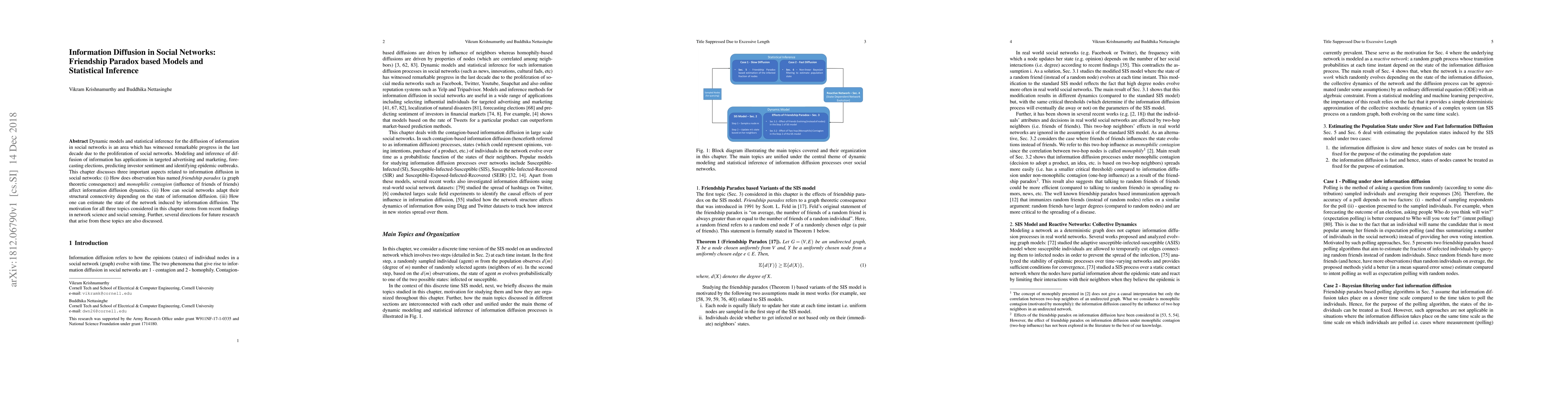 Dynamic models and statistical inference for the diffusion of information in social networks is an area which has witnessed remarkable progress in the last decade due to the proliferation of social networks. Modeling and inference of diffusion of information has applications in targeted advertising and marketing, forecasting elections, predicting investor sentiment and identifying epidemic outbreaks. This chapter discusses three important aspects related to information diffusion in social networks: (i) How does observation bias named friendship paradox (a graph theoretic consequence) and monophilic contagion (influence of friends of friends) affect information diffusion dynamics. (ii) How can social networks adapt their structural connectivity depending on the state of information diffusion. (iii) How one can estimate the state of the network induced by information diffusion. The motivation for all three topics considered in this chapter stems from recent findings in network science and social sensing. Further, several directions for future research that arise from these topics are also discussed.
