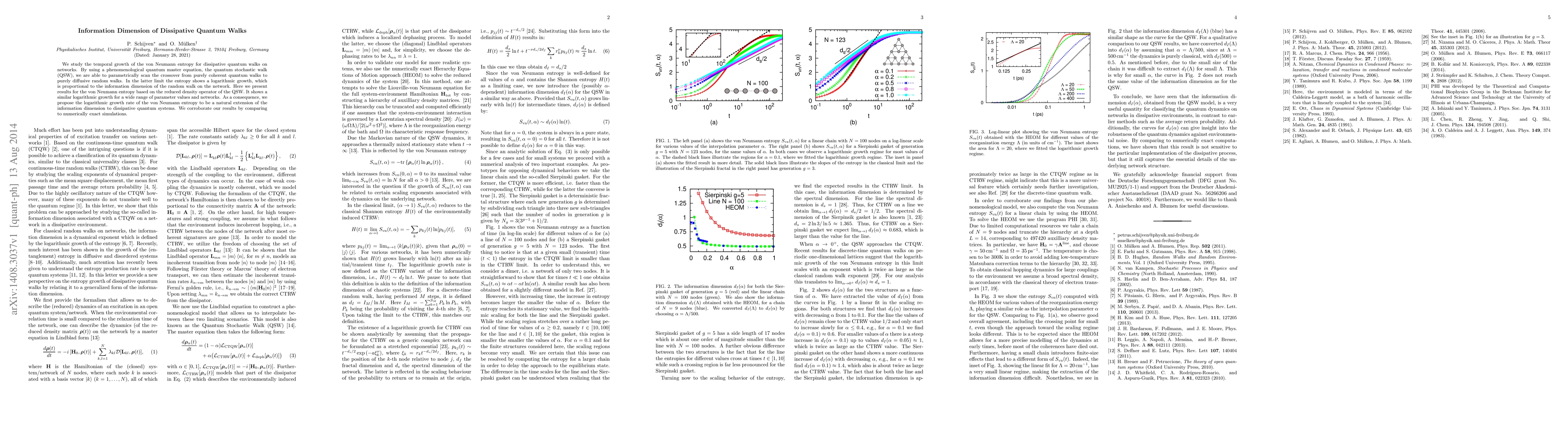 We study the temporal growth of the von Neumann entropy for dissipative quantum walks on networks. By using a phenomenological quantum master equation, the quantum stochastic walk (QSW), we are able to parametrically scan the crossover from purely coherent quantum walks to purely diffusive random walks. In the latter limit the entropy shows a logarithmic growth, which is proportional to the information dimension of the random walk on the network. Here we present results for the von Neumann entropy based on the reduced density operator of the QSW. It shows a similar logarithmic growth for a wide range of parameter values and networks. As a consequence, we propose the logarithmic growth rate of the von Neumann entropy to be a natural extension of the information dimension to dissipative quantum systems. We corroborate our results by comparing to numerically exact simulations.