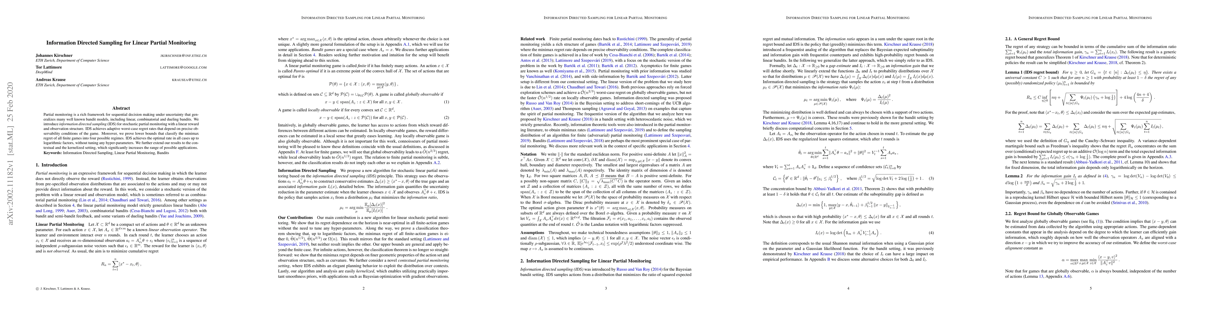 This paper introduces information directed sampling (IDS) for linear partial monitoring, achieving adaptive regret rates based on game observability. It proves optimal performance across different regimes and extends the method to contextual and kernelized settings, enhancing its applicability.