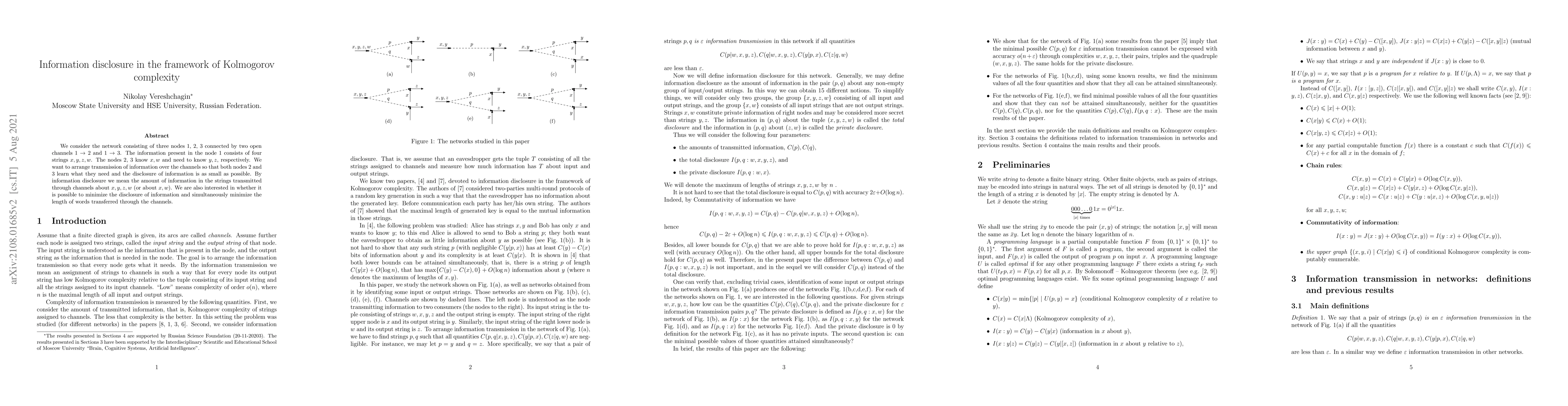 We consider the network consisting of three nodes $1, 2, 3$ connected by two open channels $1\rightarrow 2$ and $1\rightarrow 3$. The information present in the node 1 consists of four strings $x,y,z,w$. The nodes $2, 3$ know $x,w$ and need to know $y,z$, respectively. We want to arrange transmission of information over the channels so that both nodes $2$ and $3$ learn what they need and the disclosure of information is as small as possible. By information disclosure we mean the amount of information in the strings transmitted through channels about $x,y,z,w$ (or about $x,w$). We are also interested in whether it is possible to minimize the disclosure of information and simultaneously minimize the length of words transferred through the channels.