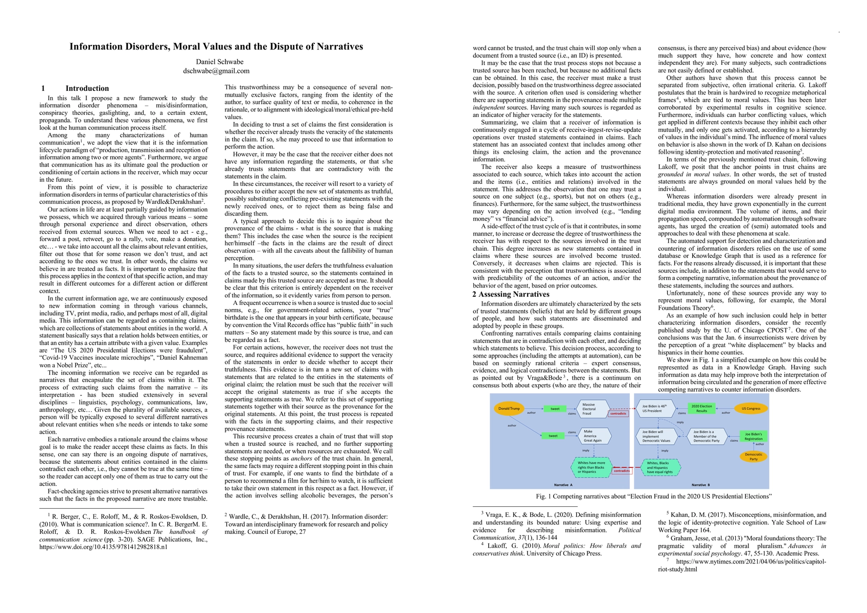 In this paper we propose a framework characterizing information disorders as disputes of narratives. Such narratives present claims to readers, who must decide whether to accept the statements in the claims as facts. We point out that this process requires establishing connections to moral values, since it has been shown that human decision making is heavily dependent on them. A simple example illustrating how this could be done is given, related to claims about fraud in the US 2020 Presidential elections.