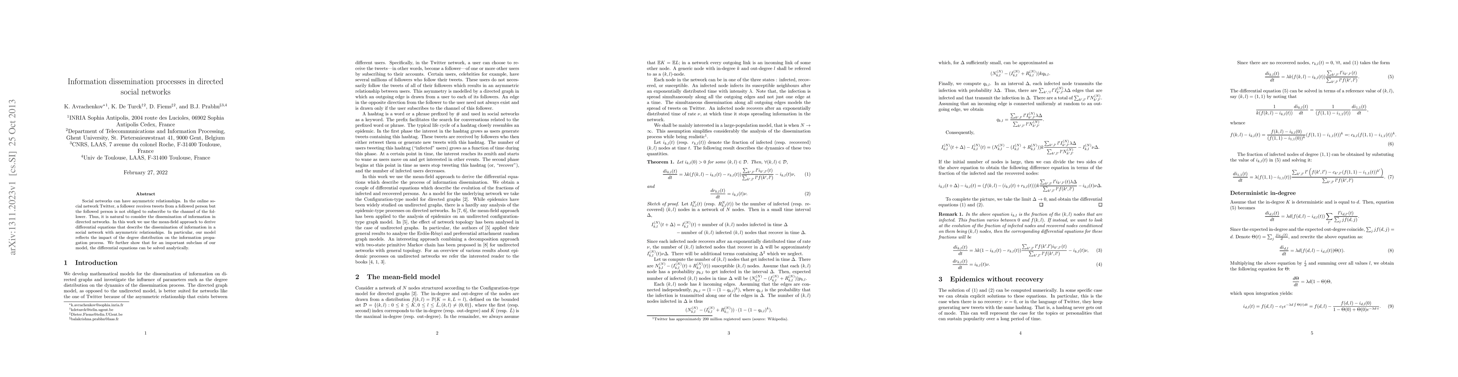 This paper employs the mean-field approach to derive differential equations for information dissemination in directed social networks, such as Twitter, highlighting the impact of asymmetric relationships and degree distribution on the propagation process, with some results being analytically solvable.