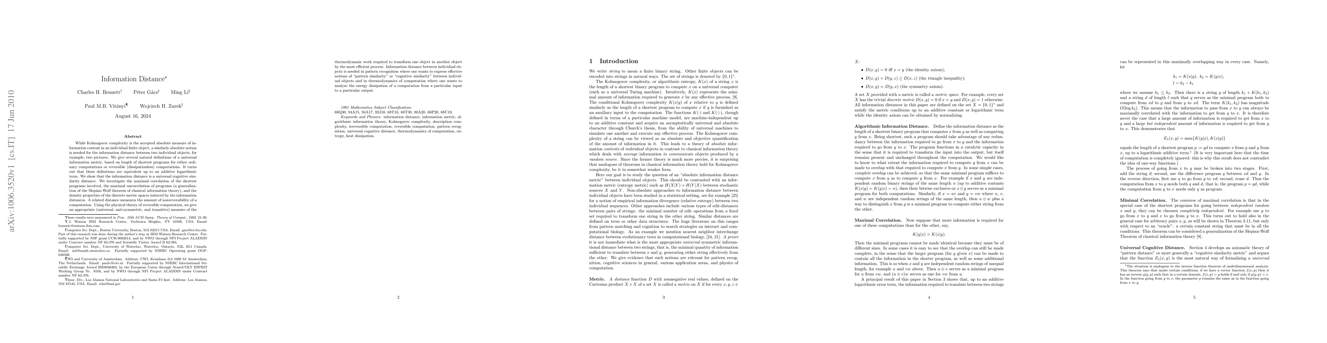 This paper proposes universal metrics for information distance between two objects, such as pictures, based on the length of shortest computational programs. It demonstrates that these metrics are equivalent up to a logarithmic term and explores their implications for pattern recognition and the thermodynamics of computation.