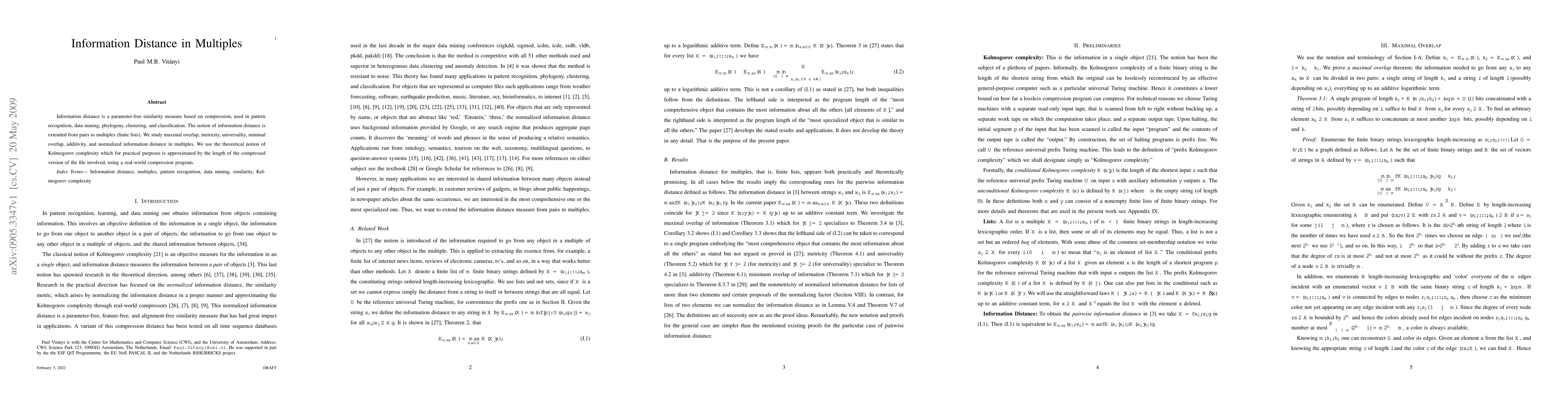 This paper extends the concept of information distance, a parameter-free similarity measure based on compression, to handle multiples (finite lists) instead of pairs. It explores properties like maximal overlap, metricity, and universality in the context of multiples, using Kolmogorov complexity approximated by compression length for practical applications.
