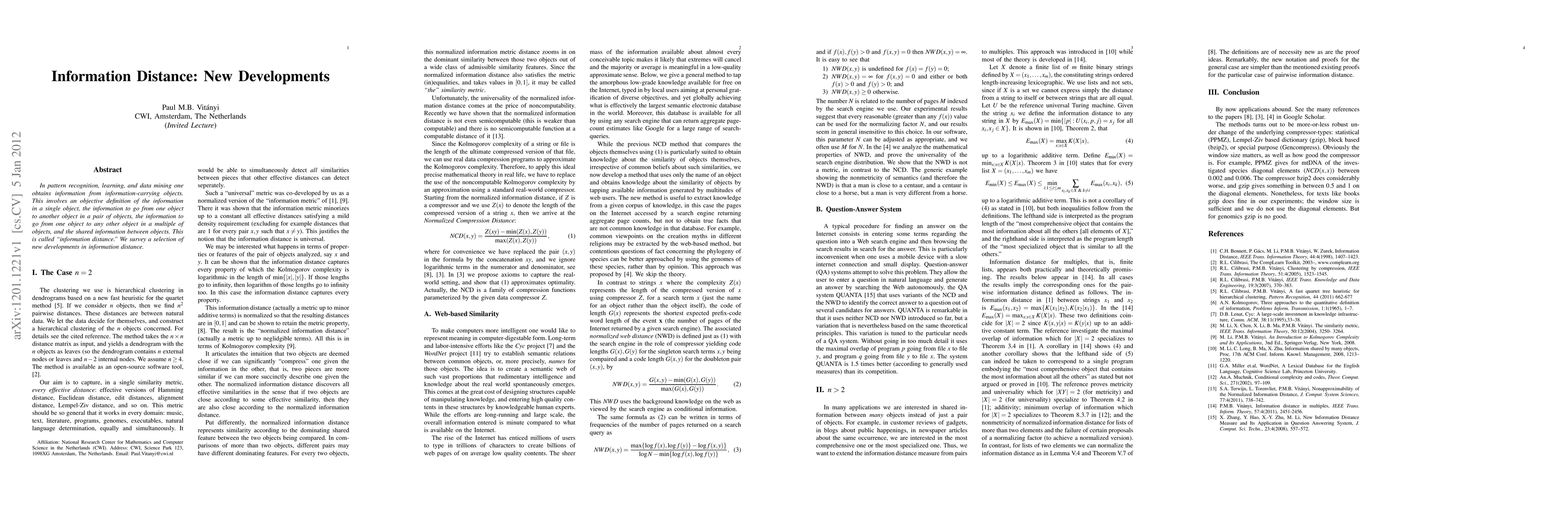 In pattern recognition, learning, and data mining one obtains information from information-carrying objects. This involves an objective definition of the information in a single object, the information to go from one object to another object in a pair of objects, the information to go from one object to any other object in a multiple of objects, and the shared information between objects. This is called "information distance." We survey a selection of new developments in information distance.