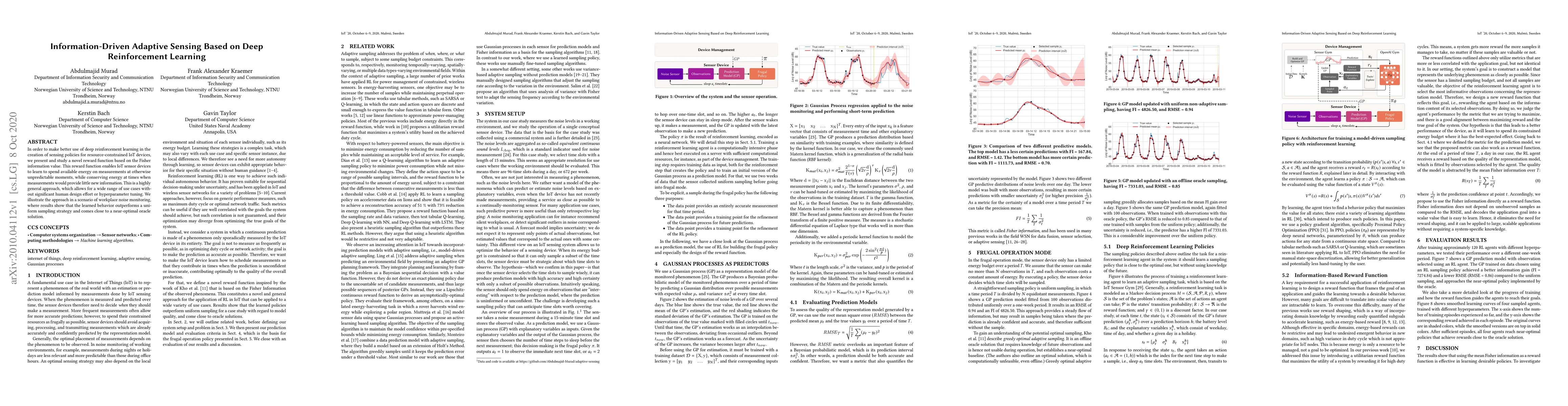 In order to make better use of deep reinforcement learning in the creation of sensing policies for resource-constrained IoT devices, we present and study a novel reward function based on the Fisher information value. This reward function enables IoT sensor devices to learn to spend available energy on measurements at otherwise unpredictable moments, while conserving energy at times when measurements would provide little new information. This is a highly general approach, which allows for a wide range of use cases without significant human design effort or hyper-parameter tuning. We illustrate the approach in a scenario of workplace noise monitoring, where results show that the learned behavior outperforms a uniform sampling strategy and comes close to a near-optimal oracle solution.