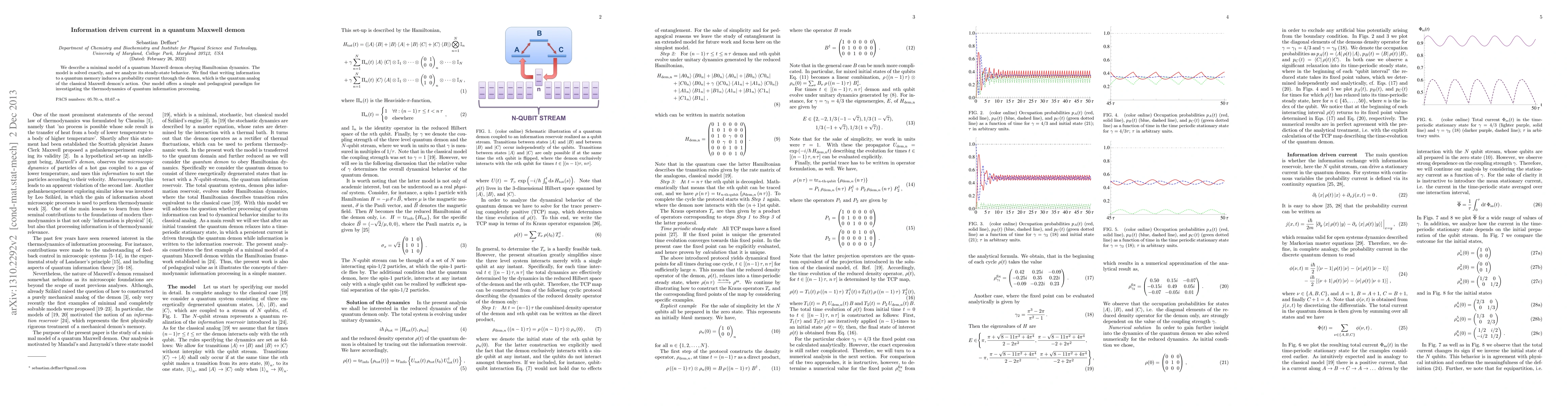 This paper presents a quantum model of a Maxwell demon under Hamiltonian dynamics, solved exactly, and reveals that storing information in a quantum memory generates a probability current, analogous to the classical demon's action, providing a clear framework for studying quantum information thermodynamics.