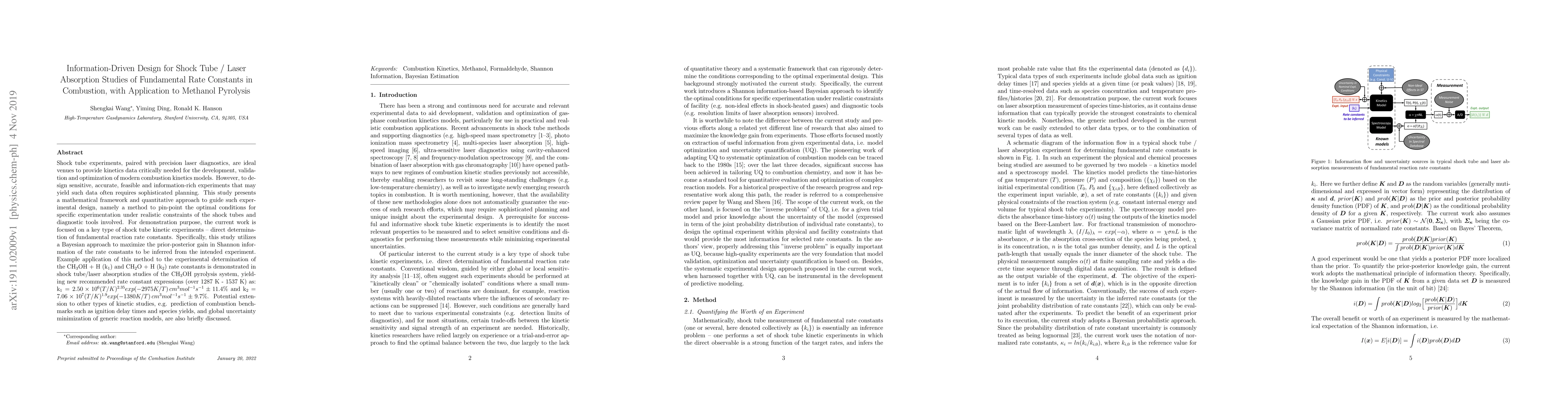 Shock tube experiments, paired with precision laser diagnostics, are ideal venues to provide kinetics data critically needed for the development, validation and optimization of modern combustion kinetics models. However, to design sensitive, accurate, feasible and information-rich experiments that may yield such data often requires sophisticated planning. This study presents a mathematical framework and quantitative approach to guide such experimental design, namely a method to pin-point the optimal conditions for specific experimentation under realistic constraints of the shock tubes and diagnostic tools involved. For demonstration purpose, the current work is focused on a key type of shock tube kinetic experiments -- direct determination of fundamental reaction rate constants. Specifically, this study utilizes a Bayesian approach to maximize the prior-posterior gain in Shannon information of the rate constants to be inferred from the intended experiment. Example application of this method to the experimental determination of the CH$_3$OH + H (k$_1$) and CH$_2$O + H (k$_2$) rate constants is demonstrated in shock tube/laser absorption studies of the CH$_3$OH pyrolysis system, yielding new recommended rate constant expressions (over 1287 K - 1537 K) as: k$_1$ = $ 2.50 \times 10^6 (T/K)^{2.35} exp(-2975 K /T) \, cm^3mol^{-1}s^{-1} \pm 11.4\%$ and k$_2$ = $7.06 \times 10^7 (T/K)^{1.9} exp(-1380 K/T) \, cm^3mol^{-1}s^{-1} \pm 9.7 \%$. Potential extension to other types of kinetic studies, e.g. prediction of combustion benchmarks such as ignition delay times and species yields, and global uncertainty minimization of generic reaction models, are also briefly discussed.