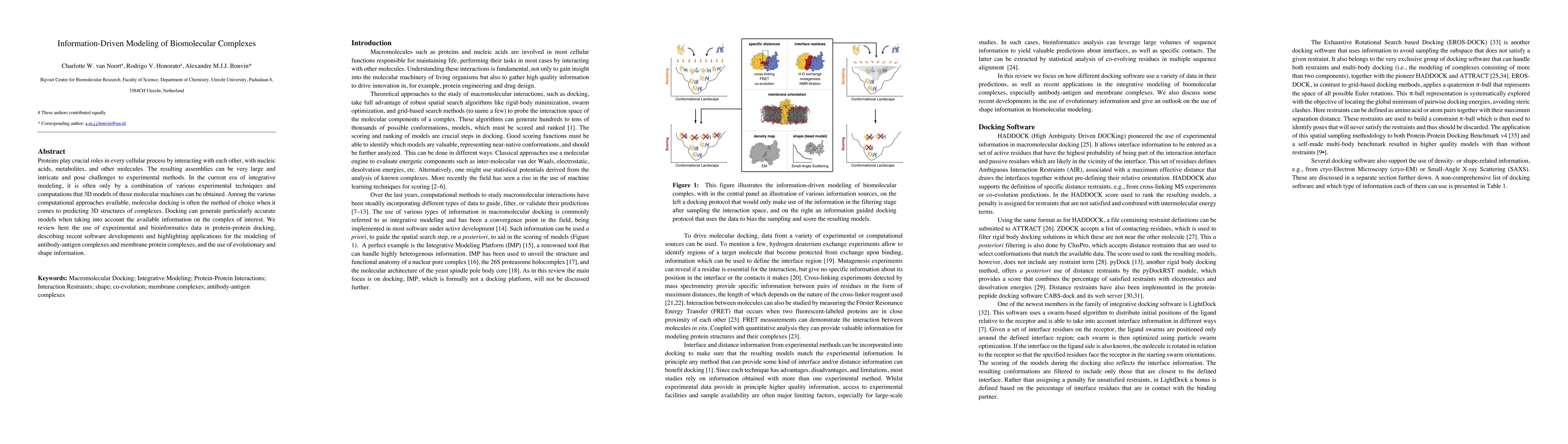 This paper reviews the integration of experimental and bioinformatics data to enhance molecular docking for predicting 3D structures of biomolecular complexes, focusing on recent software advancements and applications in antibody-antigen and membrane protein complex modeling, leveraging evolutionary and shape information.