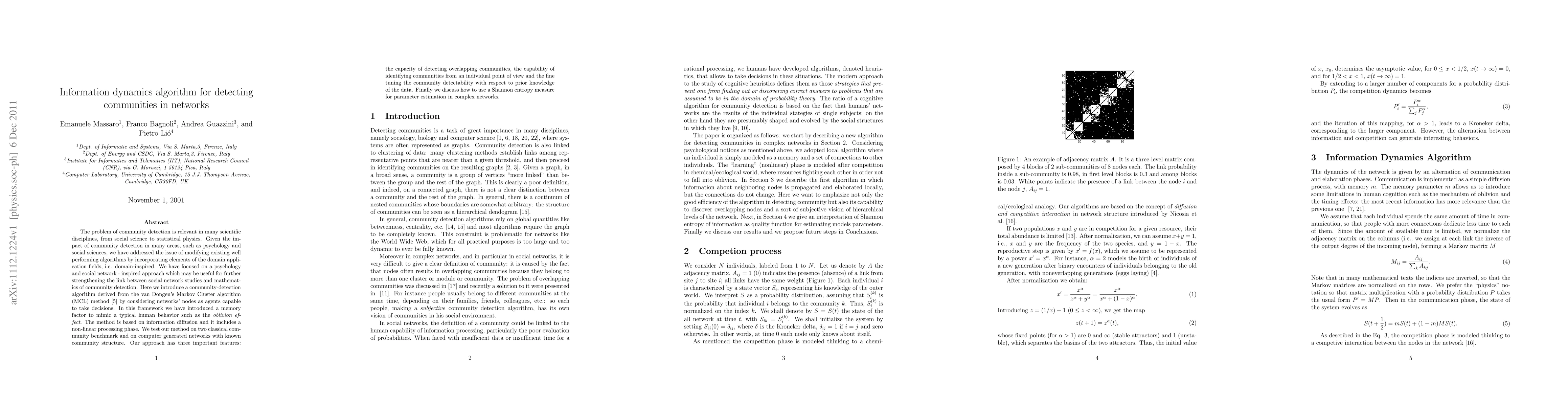 The problem of community detection is relevant in many scientific disciplines, from social science to statistical physics. Given the impact of community detection in many areas, such as psychology and social sciences, we have addressed the issue of modifying existing well performing algorithms by incorporating elements of the domain application fields, i.e. domain-inspired. We have focused on a psychology and social network - inspired approach which may be useful for further strengthening the link between social network studies and mathematics of community detection. Here we introduce a community-detection algorithm derived from the van Dongen's Markov Cluster algorithm (MCL) method by considering networks' nodes as agents capable to take decisions. In this framework we have introduced a memory factor to mimic a typical human behavior such as the oblivion effect. The method is based on information diffusion and it includes a non-linear processing phase. We test our method on two classical community benchmark and on computer generated networks with known community structure. Our approach has three important features: the capacity of detecting overlapping communities, the capability of identifying communities from an individual point of view and the fine tuning the community detectability with respect to prior knowledge of the data. Finally we discuss how to use a Shannon entropy measure for parameter estimation in complex networks.