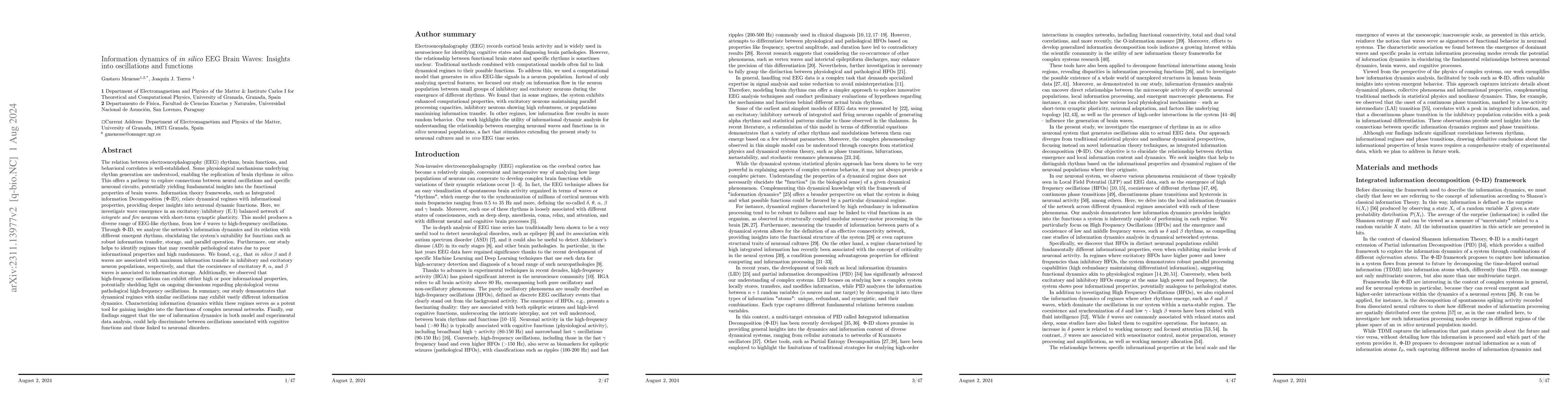 Discriminating between physiological waves, linked to functional brain properties, and pathological waves, due to brain malfunction, is problematic, e. g., for high-frequency oscillations (HFO) as high $\gamma$ waves. Brain rhythms observed in EEG can also be observed in excitatory/inhibitory (E/I) NN models. Such models allow to study the relationship between waves and neuronal circuit functions, which could lead to fundamental insights to discriminating waves. To address this and other questions, we explore the emergence of high gamma rhythms in an E/I balanced neural population of integrated and fire neurons with short-term synaptic plasticity. This model generates a rich repertoire of EEG-like rhythms, including high-frequency excitatory and inhibitory oscillations. Using the integrated information decomposition framework (Phi-ID), we explore the information dynamics of the network and its relationship with excitatory and inhibitory activity and high-frequency rhythms. In regions where high gamma rhythms emerge only in the excitatory population, we see informational properties in the network more favorable for computation and processing information, corresponding then to functional regimes. However, regions where high gamma rhythms also emerge in the inhibitory population present lower mutual information in general, and the system becomes less predictable, a fact that can be linked to a less functional or ``pathological" regime. In the second case, we observe that both excitatory and inhibitory populations oscillate with the same dominant frequency, which is higher than in the first case. Higher frequency oscillations and synchronization are commonly associated with epileptic seizures so adopting an information dynamics approach could help differentiate between high-frequency oscillations related to cognitive functions from those related to neuronal disorders such as epilepsy.