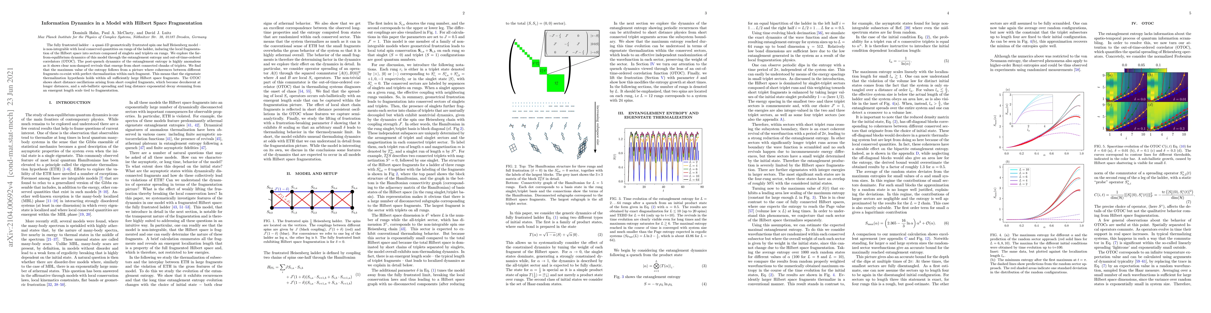 The fully frustrated ladder - a quasi-1D geometrically frustrated spin one half Heisenberg model - is non-integrable with local conserved quantities on rungs of the ladder, inducing the fragmentation of the Hilbert space into sectors composed of singlets and triplets on rungs. We explore the far-from-equilibrium dynamics of this model through the entanglement entropy and out-of-time-ordered correlators (OTOC). The post-quench dynamics of the entanglement entropy is highly anomalous as it shows clear non-damped revivals that emerge from short connected chunks of triplets and whose persistence is therefore a consequence of fragmentation. We find that the maximum value of the entropy follows from a picture where coherences between different fragments co-exist with perfect thermalization within each fragment. This means that the eigenstate thermalization hypothesis holds within all sufficiently large Hilbert space fragments. The OTOC shows short distance oscillations arising from short coupled fragments, which become decoherent at longer distances, and a sub-ballistic spreading and long distance exponential decay stemming from an emergent length scale tied to fragmentation.