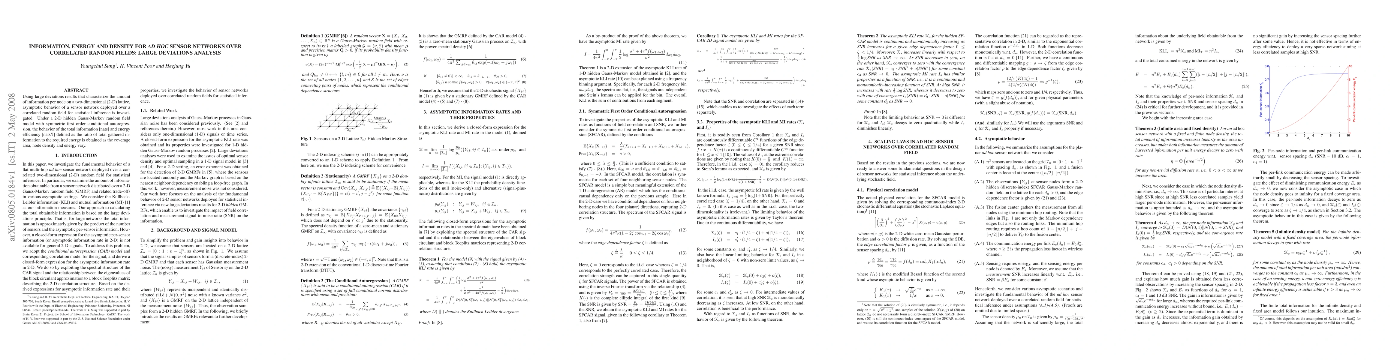 This paper investigates the asymptotic behavior of information per node and energy efficiency in ad hoc sensor networks deployed over correlated random fields using large deviations analysis. It focuses on a 2-D hidden Gauss-Markov random field model and examines how total information and energy efficiency change with varying coverage area, node density, and energy consumption.