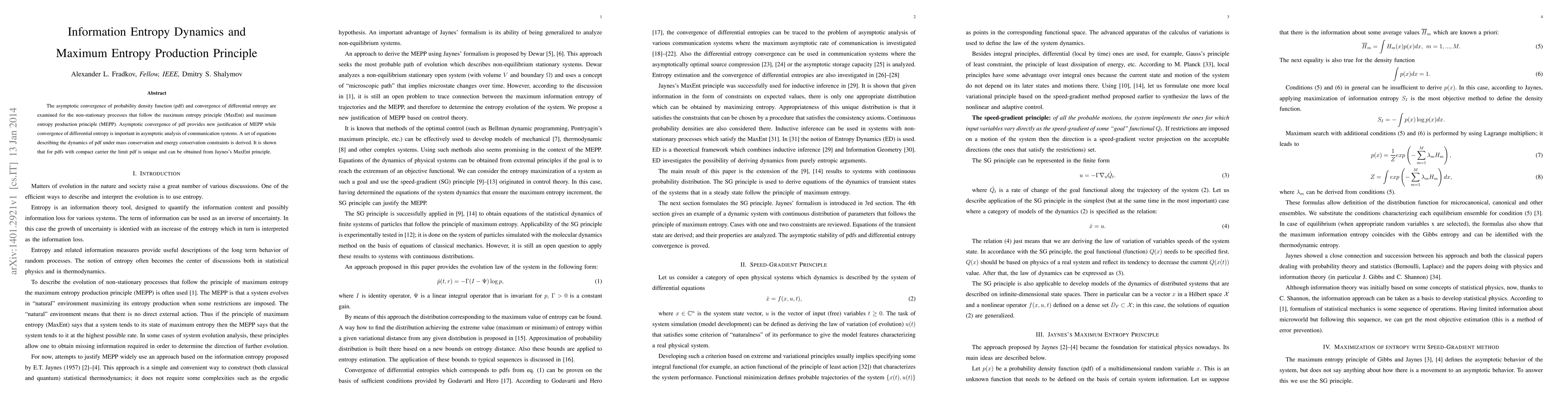 The asymptotic convergence of probability density function (pdf) and convergence of differential entropy are examined for the non-stationary processes that follow the maximum entropy principle (MaxEnt) and maximum entropy production principle (MEPP). Asymptotic convergence of pdf provides new justification of MEPP while convergence of differential entropy is important in asymptotic analysis of communication systems. A set of equations describing the dynamics of pdf under mass conservation and energy conservation constraints is derived. It is shown that for pdfs with compact carrier the limit pdf is unique and can be obtained from Jaynes's MaxEnt principle.