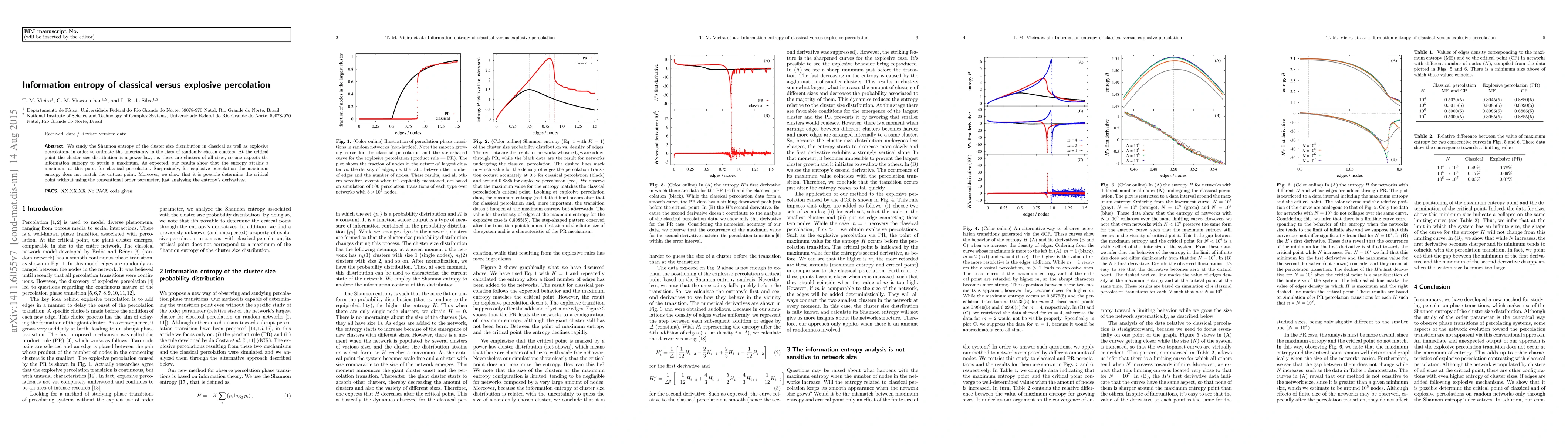 We study the Shannon entropy of the cluster size distribution in classical as well as explosive percolation, in order to estimate the uncertainty in the sizes of randomly chosen clusters. At the critical point the cluster size distribution is a power-law, i.e. there are clusters of all sizes, so one expects the information entropy to attain a maximum. As expected, our results show that the entropy attains a maximum at this point for classical percolation. Surprisingly, for explosive percolation the maximum entropy does not match the critical point. Moreover, we show that it is possible determine the critical point without using the conventional order parameter, just analysing the entropy's derivatives.