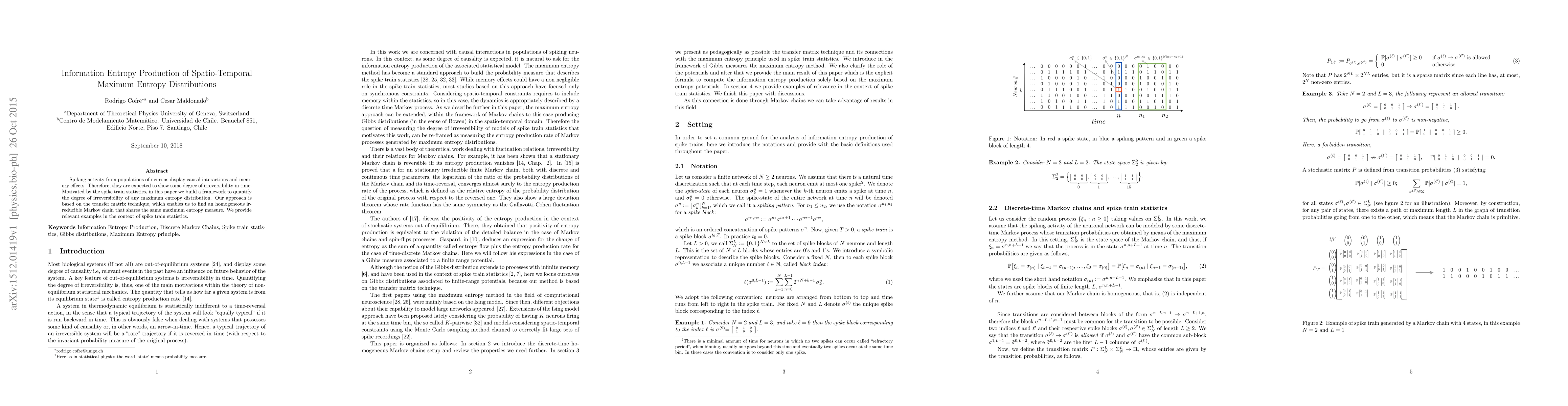 Spiking activity from populations of neurons display causal interactions and memory effects. Therefore, they are expected to show some degree of irreversibility in time. Motivated by the spike train statistics, in this paper we build a framework to quantify the degree of irreversibility of any maximum entropy distribution. Our approach is based on the transfer matrix technique, which enables us to find an homogeneous irreducible Markov chain that shares the same maximum entropy measure. We provide relevant examples in the context of spike train statistics