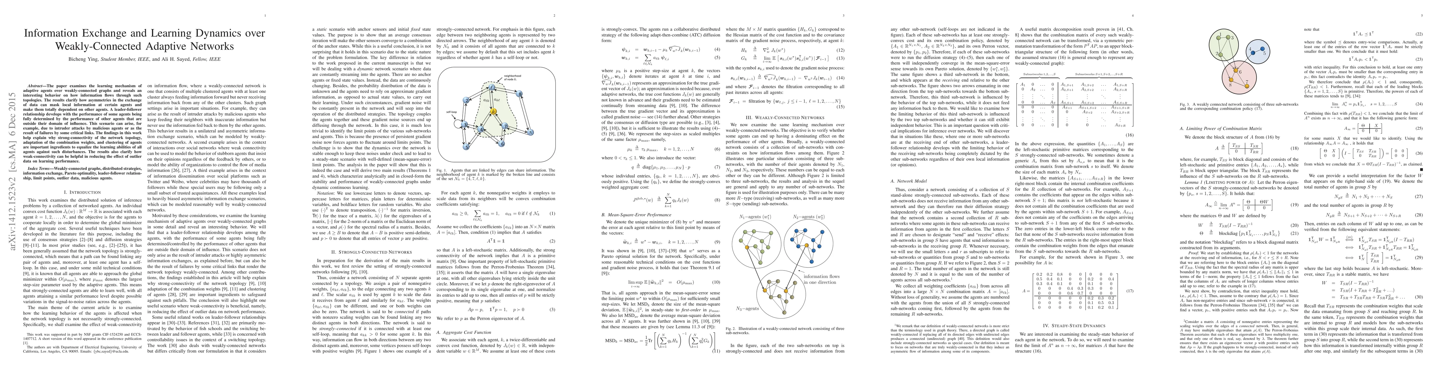 The paper examines the learning mechanism of adaptive agents over weakly-connected graphs and reveals an interesting behavior on how information flows through such topologies. The results clarify how asymmetries in the exchange of data can mask local information at certain agents and make them totally dependent on other agents. A leader-follower relationship develops with the performance of some agents being fully determined by the performance of other agents that are outside their domain of influence. This scenario can arise, for example, due to intruder attacks by malicious agents or as the result of failures by some critical links. The findings in this work help explain why strong-connectivity of the network topology, adaptation of the combination weights, and clustering of agents are important ingredients to equalize the learning abilities of all agents against such disturbances. The results also clarify how weak-connectivity can be helpful in reducing the effect of outlier data on learning performance.