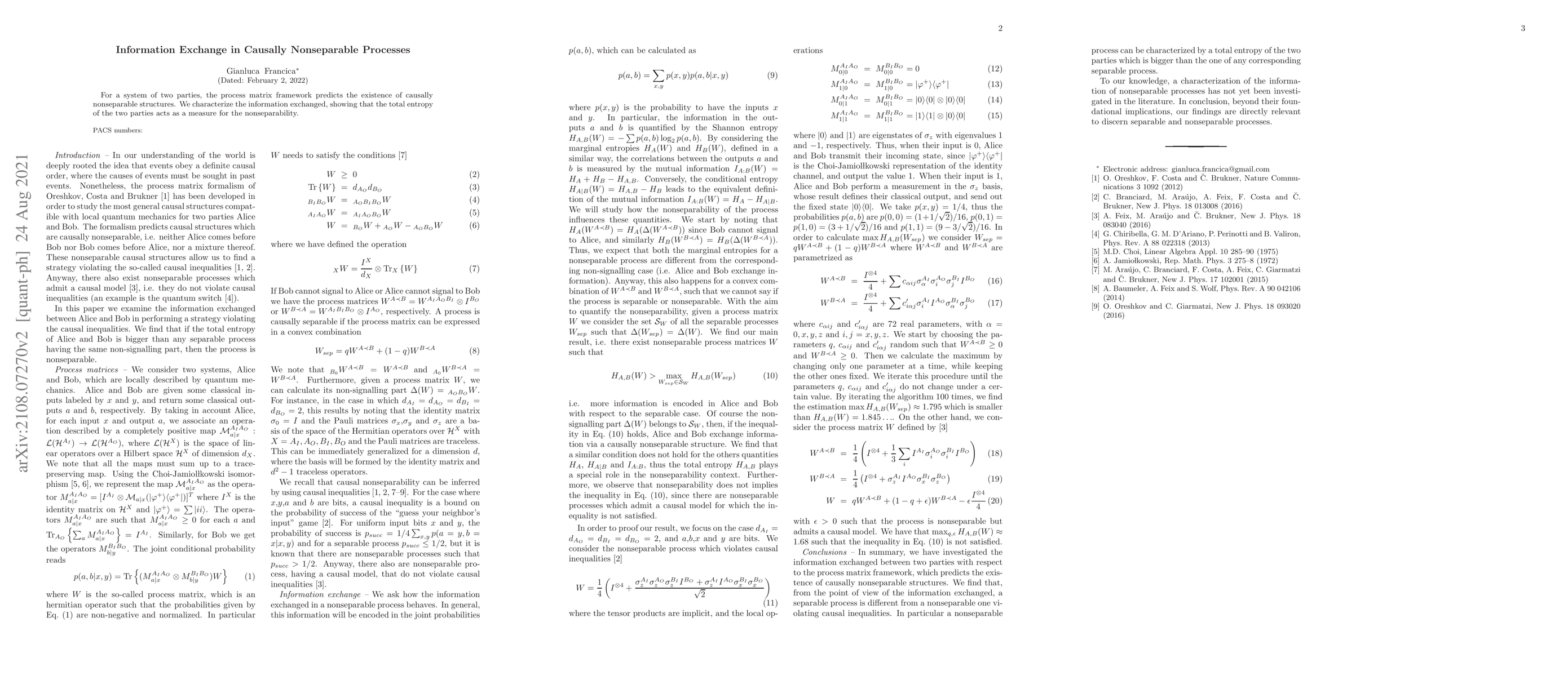 Summary: This paper explores the information exchange in systems where causally nonseparable processes exist, demonstrating that the total entropy of two parties serves as a measure of this nonseparability within the process matrix framework.